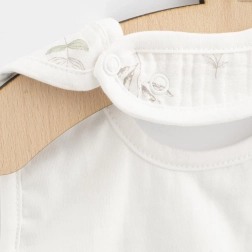 De praktische sluiting met drukknoopjes maakt het mogelijk om 2 maten in te stellen, waardoor de slab met het kind meegroeit. Duurzame 100% katoen kan herhaaldelijk gewassen worden en wordt na verloop van tijd nog zachter. De OEKO-TEX STANDARD 100-certificering bevestigt de gezondheidsveiligheid van het materiaal.