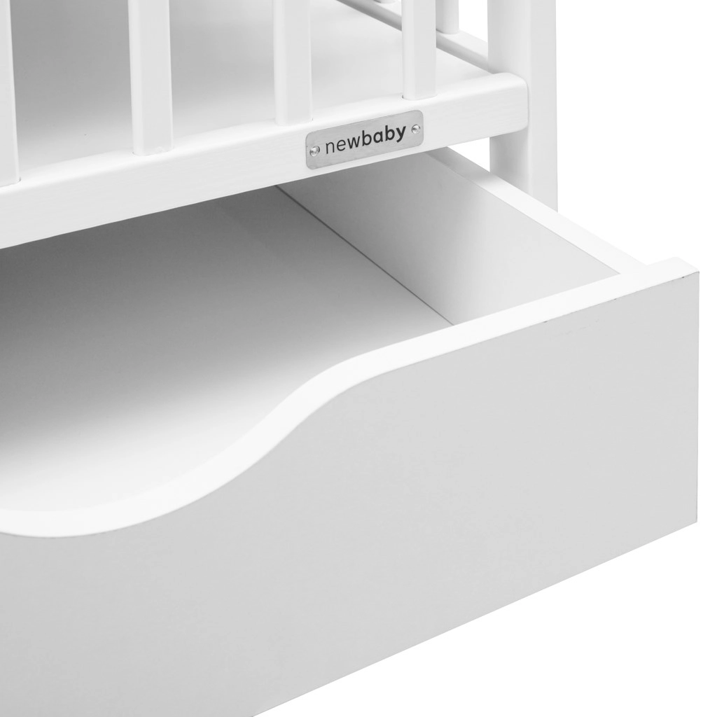 Praktisch en veilig kinderledikant NEW BABY Basic in het wit, combineert massief grenenhout, 3 lattenbodem-posities en een geïntegreerde lade voor beddengoed of babybenodigdheden. Gecertificeerde materialen, een geventileerde lattenbodem voor betere luchtcirculatie en 3 uitneembare spijlen voor gemakkelijke toegang zorgen elke dag voor comfort en veiligheid.