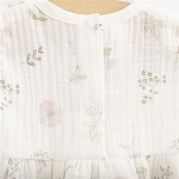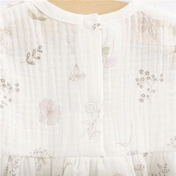 Mousseline van 100% katoen is niet alleen uitzonderlijk aangenaam, maar ook duurzaam – met elke wasbeurt wordt hij nog zachter en behoudt hij zijn vorm. De drukknoopsluiting achter maakt snel omkleden makkelijk, waardoor de jurk perfect is voor dagelijks dragen en zomerse uitstapjes.