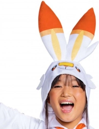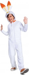 Deze witte overall met capuchon is geïnspireerd op Scorbunny uit de wereld van POKEMON. Dankzij de zachte polyesterstof, de praktische voorsluiting en details zoals lange oren en een staart is het kostuum ideaal voor carnaval, schooloptredens en dagelijks verkleden thuis.