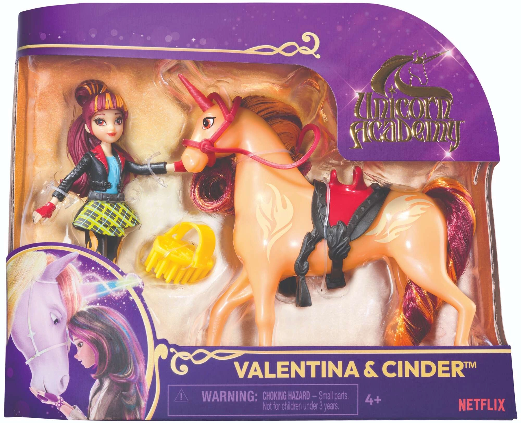 De set Valentina & Cinder van Spin Master is geïnspireerd op de populaire animatieserie UNICORN ACADEMY. Kinderen kunnen de avonturen bij het Sparkle Lake opnieuw beleven, vriendschappen versterken en de magische krachten van eenhoorns ontdekken. De pop draagt de kenmerkende outfit uit de serie en neemt dankzij de beweegbare ledematen moeiteloos verschillende houdingen aan in het zadel.