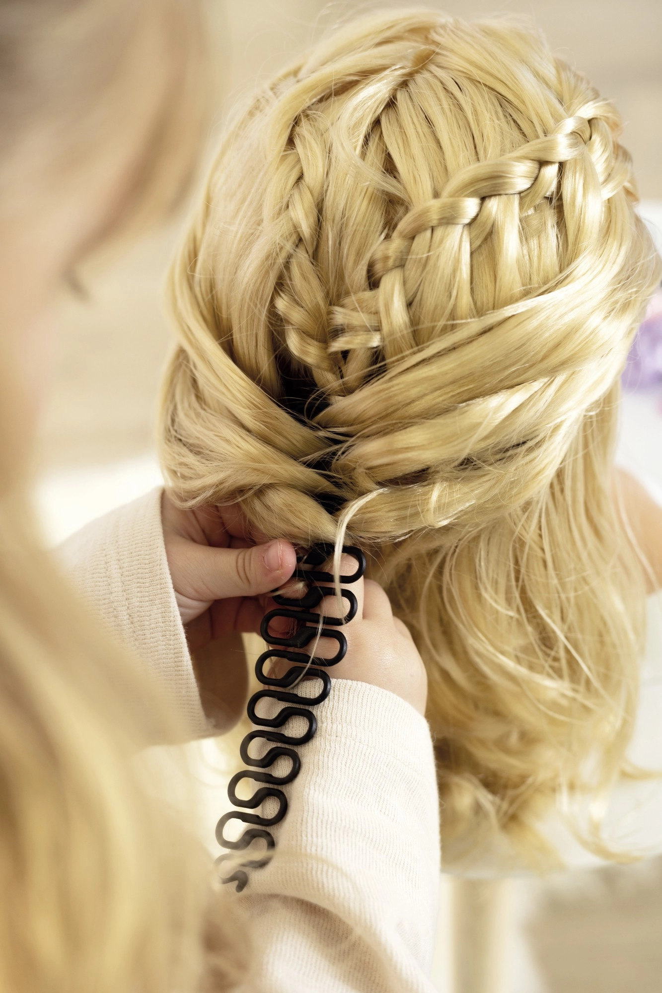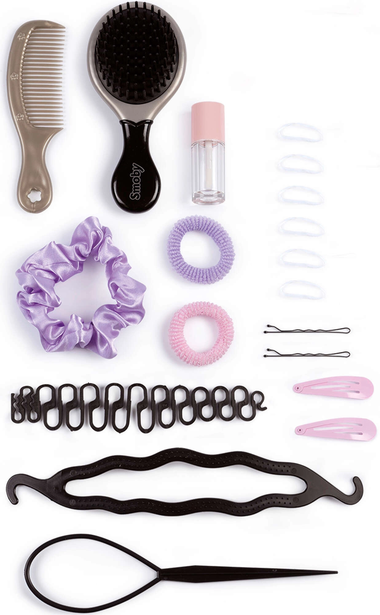 Borstel, kam, elastiekjes, speldjes, schuifspeldjes, transparante elastiekjes en speciale hulpmiddelen voor vlechten om kapsels eenvoudig te creëren.