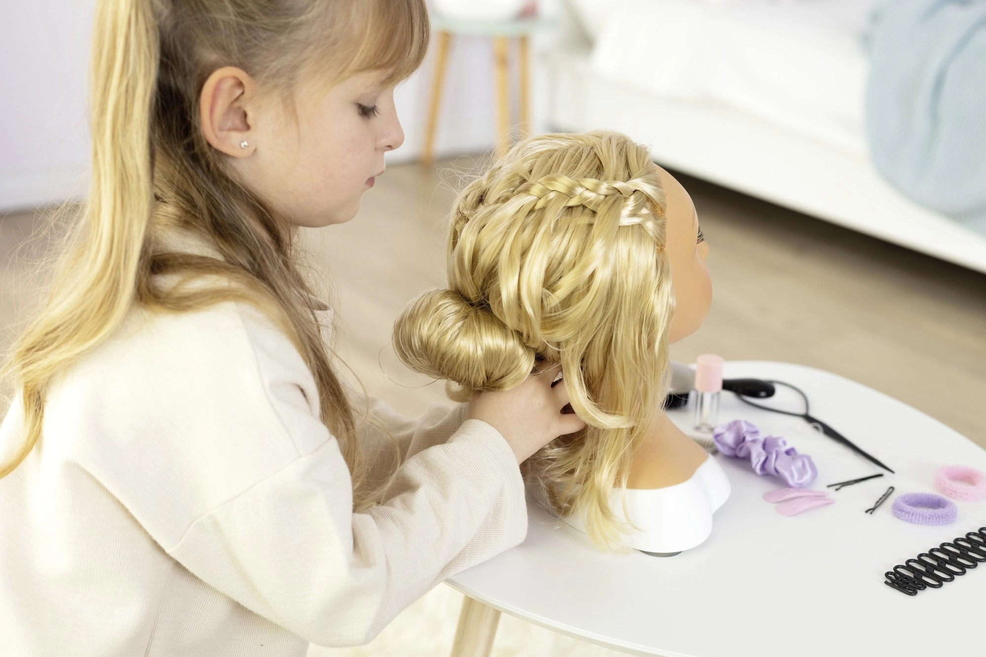 Een stevige basis of klem aan het tafelblad zorgt voor stabiliteit tijdens het kammen, zodat kinderen zich volledig op het stylen kunnen concentreren.