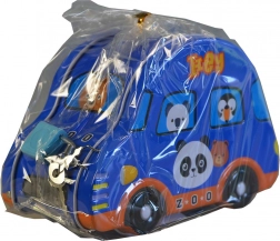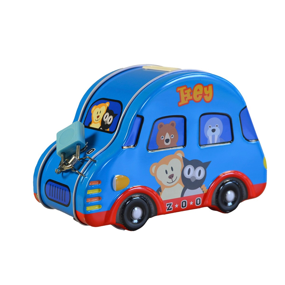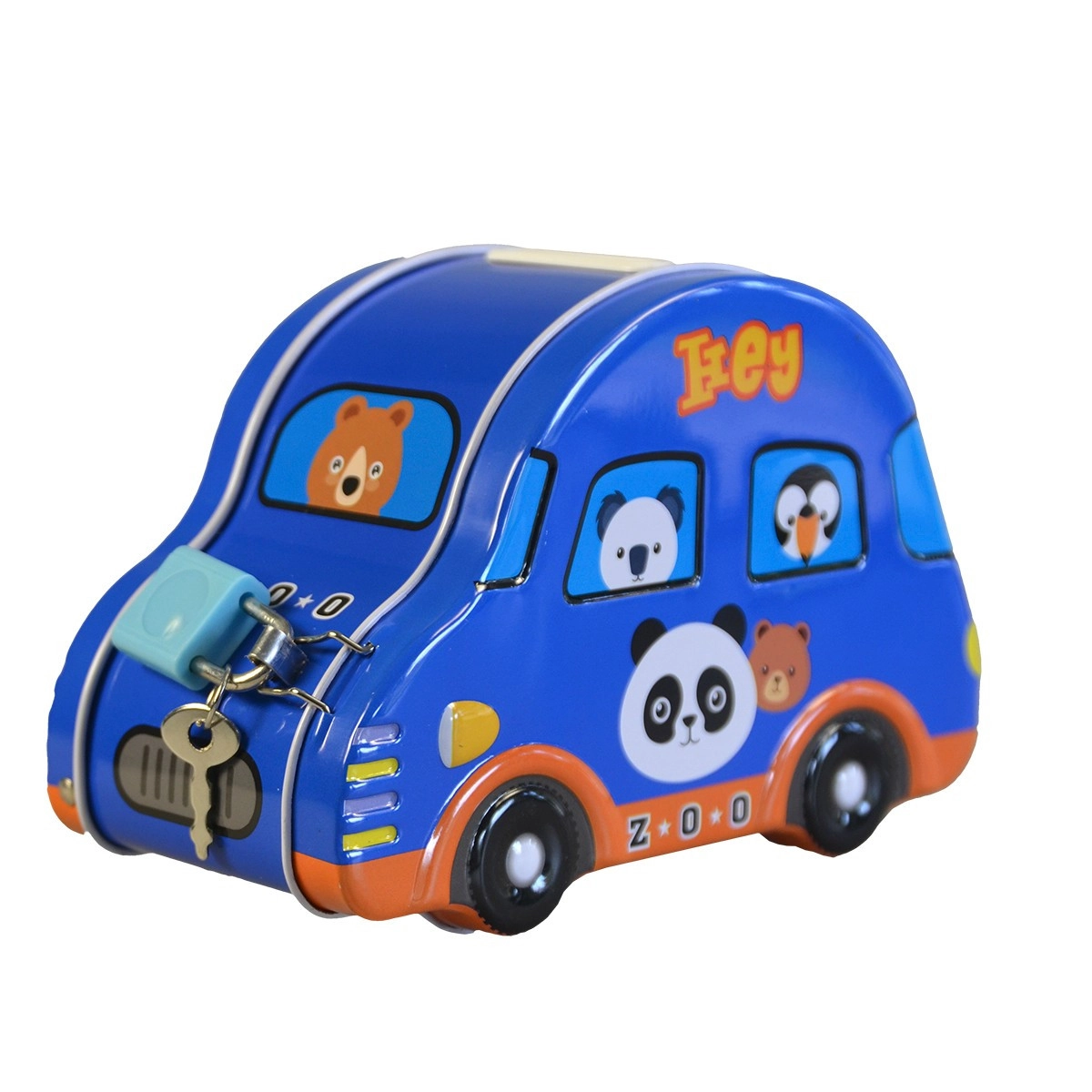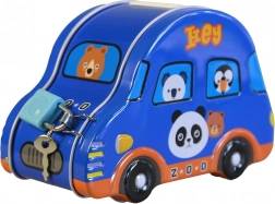 Deze kinderspaarpot in de vorm van een autootje combineert een speels design met praktische beveiliging. De metalen uitvoering is duurzaam en de kleurrijke prints met dieren vallen meteen op. Bovenaan bevindt zich een sleuf voor munten, achter of voor een klein slotje met sleuteltjes om de spaarcenten te beveiligen.