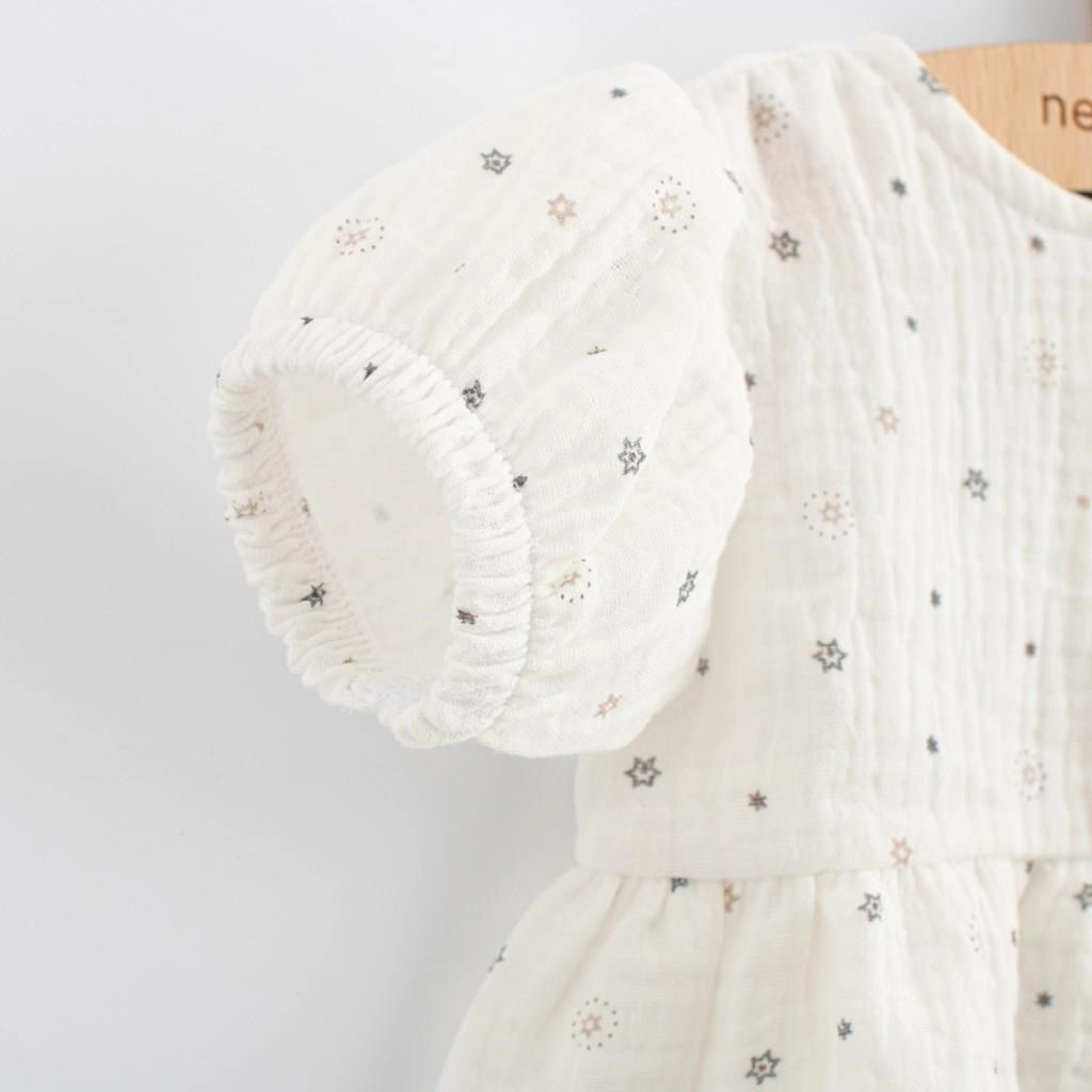 Lichtgewicht mousseline babyjurk New Baby Zora met korte mouwen, perfect voor zomerse dagen. De A-lijn en de gerimpelde rok zorgen voor comfort en flair. Knoopsluiting aan de voorkant maakt aankleden eenvoudig en 100% katoenen mousseline is ademend, zacht en mild voor de gevoelige babyhuid.