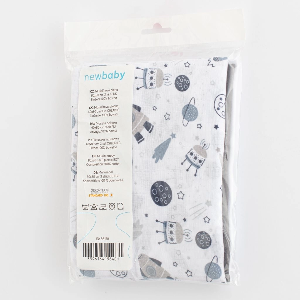 Praktische set mousseline luiers van New Baby voor jongens in het formaat 60 × 80 cm. De luiers van zachte 100% katoen absorberen vocht uitstekend, ademen goed en zijn zacht voor de gevoelige huid. De verpakking bevat 3 stuks – twee effen en één met print. Geschikt voor dagelijks gebruik thuis en onderweg.