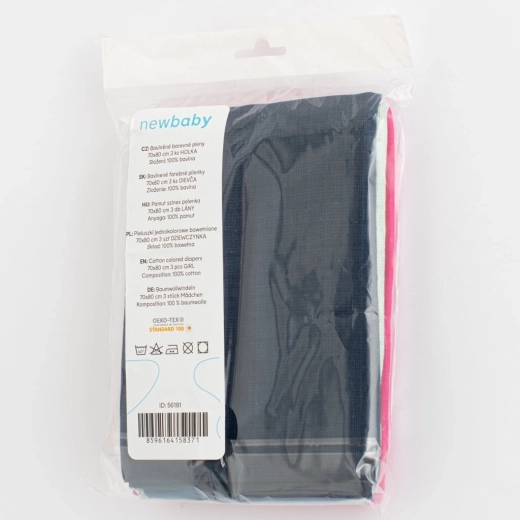 Praktische en zachte gekleurde luiers van New Baby voor meisjes, gemaakt van 100% katoen met een gewicht van 120 g/m². Ze bieden hoge ademendheid, zijn hygiënisch, zacht voor de gevoelige huid en ondersteunen bij correct gebruik een gezonde heupontwikkeling bij pasgeborenen. De verpakking bevat 3 stuks met een afmeting van 70 × 80 cm.