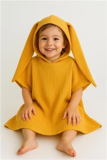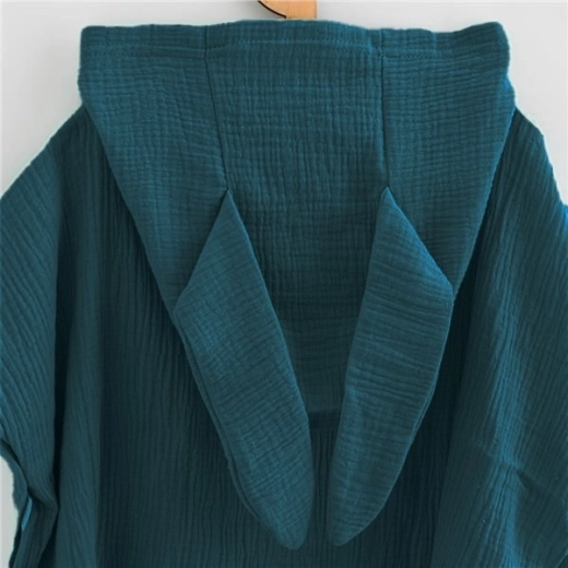 Licht en zacht kinderponcho van mousseline NEW BABY Feeling is ideaal na het bad, voor bij het zwembad en op het strand. Dankzij het materiaal van 100% katoen is het luchtig, sneldrogend en zeer absorberend. Een praktische capuchon met schattige oortjes, drukknoopjes aan de zijkanten voor gemakkelijk aankleden en een universele, losse pasvorm die meegroeit met het kind.