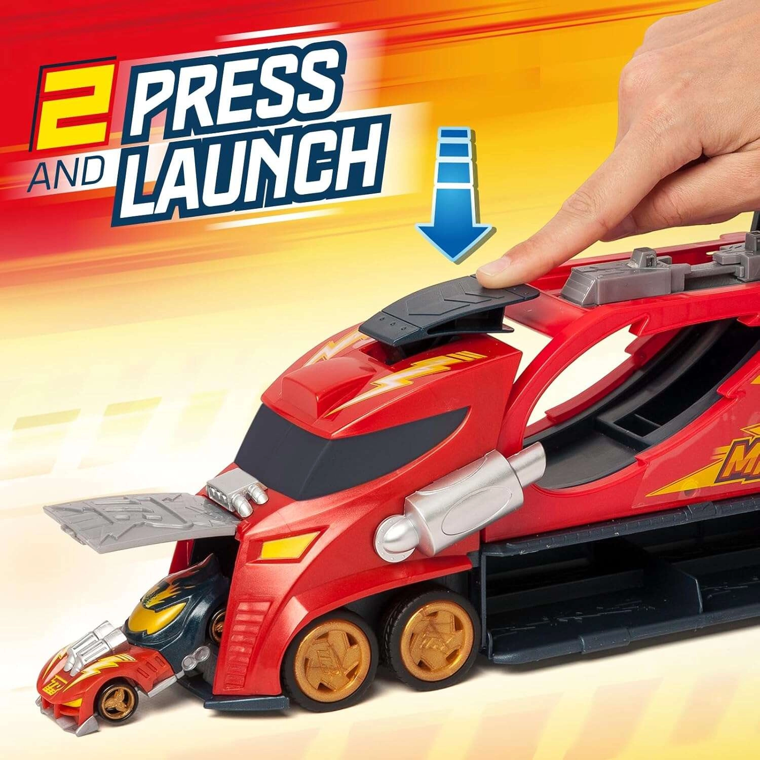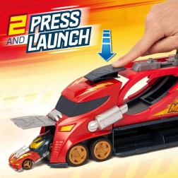 De Thunder Truck werkt als een draagbare koffer voor tot 3 autootjes en tegelijk als een krachtige lanceerder voor bliksemsnelle races.