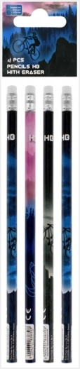 Set van 4 kwaliteits-potloden met het BICYCLE-motief, ideaal voor zowel schoolgaande kinderen als volwassenen. Elk potlood heeft hardheid HB, een lengte van 19 cm en een praktische gum aan het uiteinde. Geschikt voor schrijven en tekenen, aanbevolen voor kinderen vanaf 3 jaar.