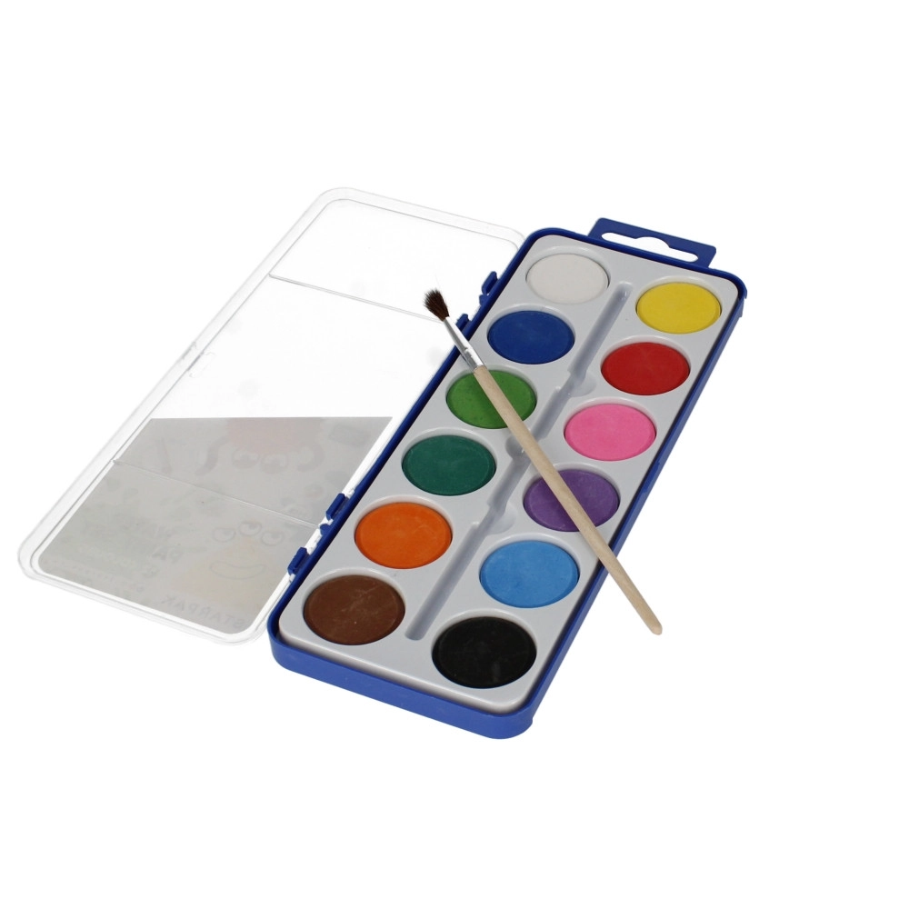 Praktische set waterverf met penseel voor kleine en grotere kunstenaars. Bevat 12 opvallende kleuren in een compact etui met afmetingen van 8 × 22 × 1 cm. Ideaal voor kinderen vanaf 3 jaar, voor thuis knutselen en voor het vak beeldende vorming op school.