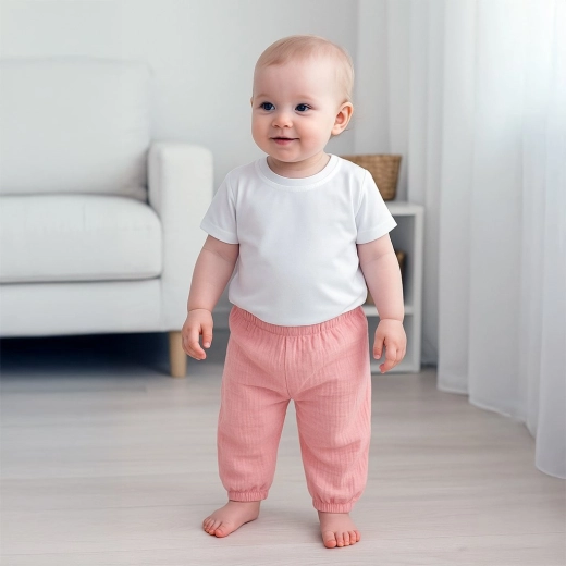 Stijlvolle en praktische tweedelige set voor kinderen, geschikt voor de kleuterklas en vrije tijd. Bevat een comfortabel katoenen T‑shirt met korte mouwen en luchtige mousseline broek. Het T‑shirt is zonder sluiting en heeft een zachte halsboord voor gemakkelijk aankleden. De broek van hoogwaardige mousseline heeft een losse pasvorm en een elastische taille en pijpen die niet knellen. Het materiaal is prettig voor de gevoelige kinderhuid en eenvoudig te onderhouden. 100% katoen, certificering OEKO-TEX STANDARD 100, ademend en duurzaam ook bij vaak wassen.