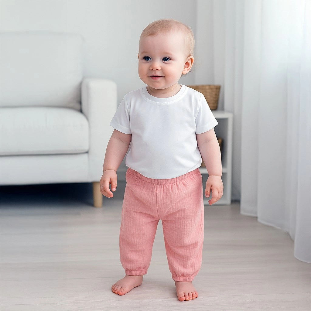 Deze kinderset combineert maximaal comfort met praktische afwerking. Het katoenen T-shirt is zacht, ademend en dankzij de zachte halsboord knelt het niet, ook niet bij de hele dag dragen. De mousseline broek is licht, duurzaam en aangenaam aanvoelend – ideaal voor actieve kinderen.