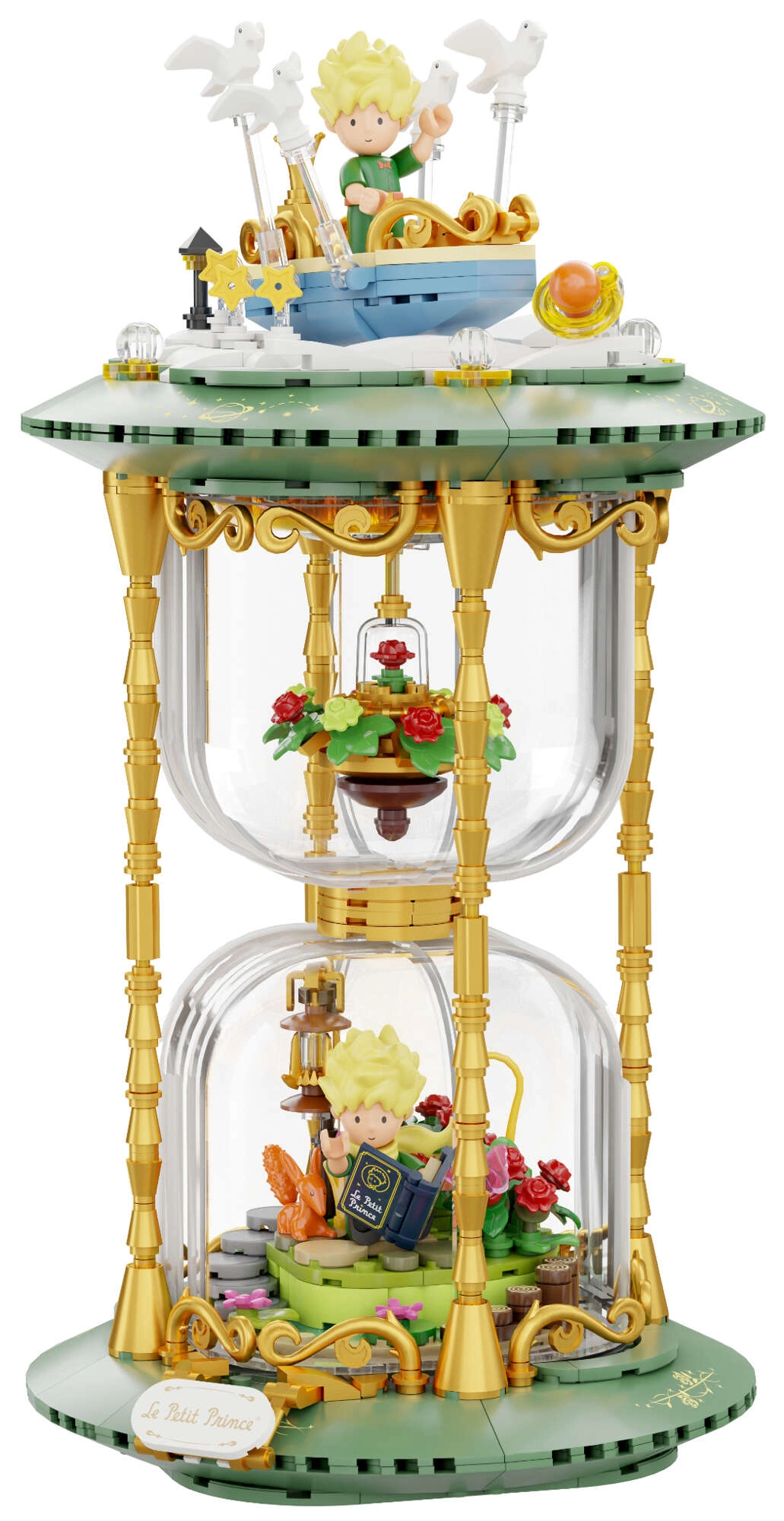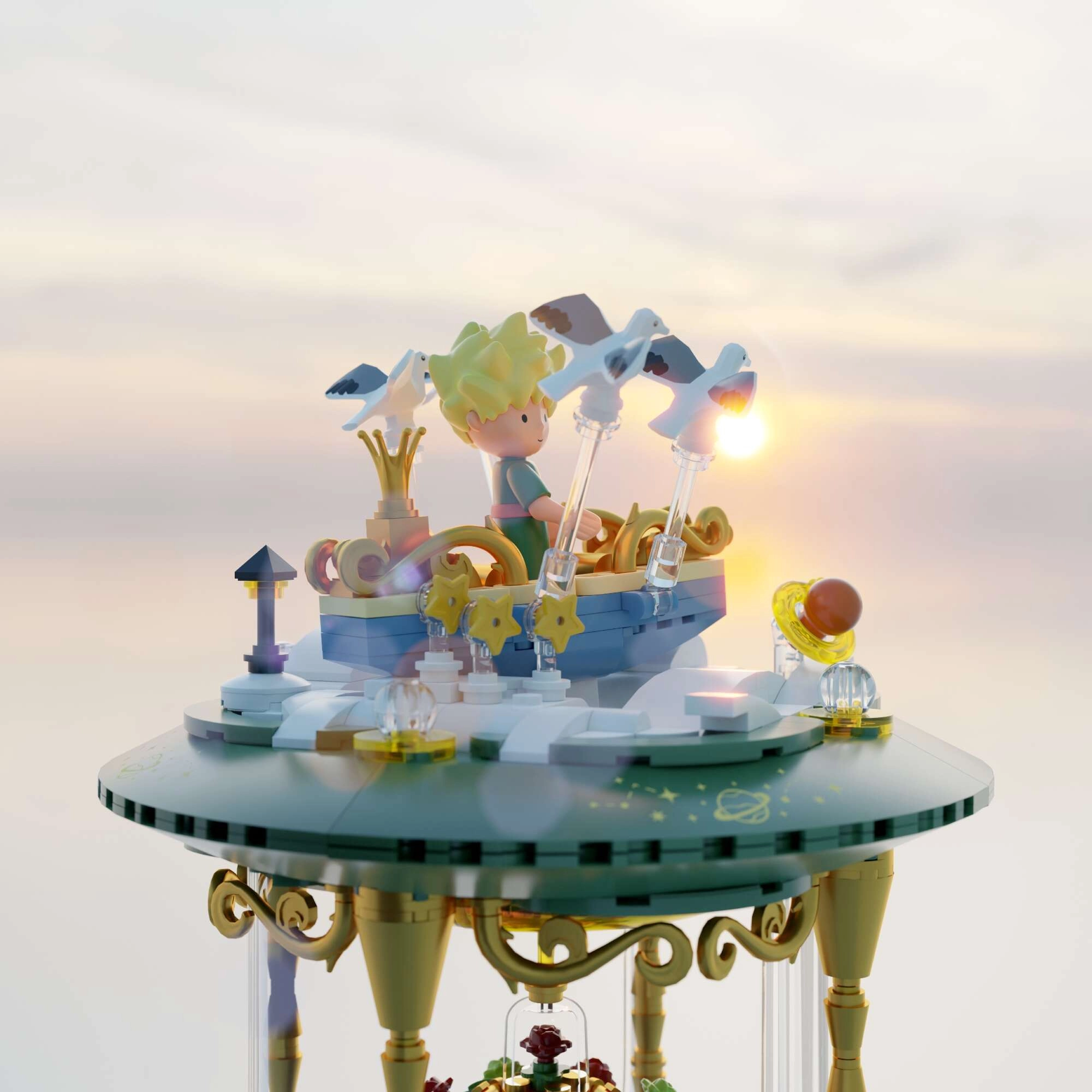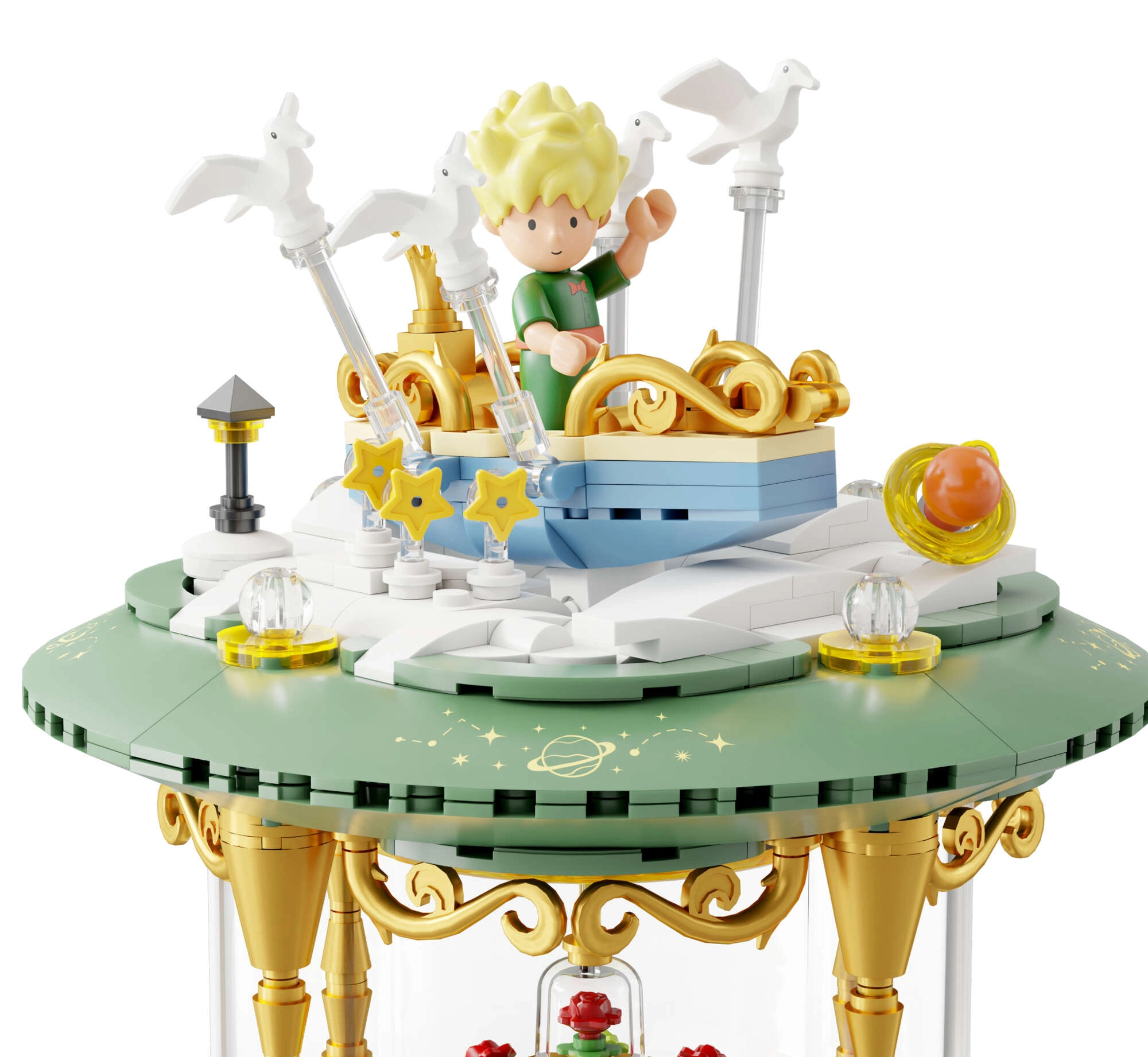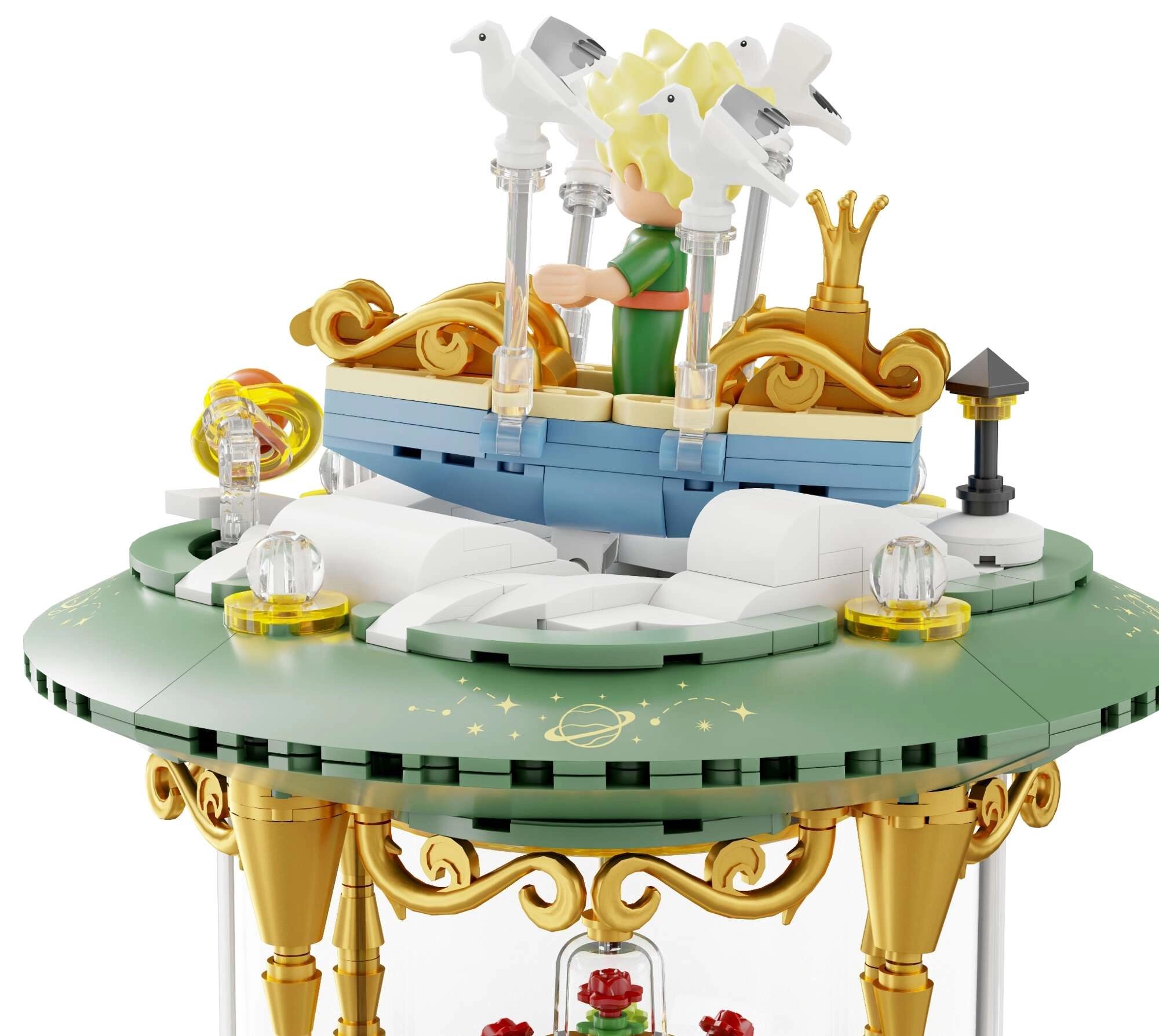 Mini-scenes met de prins, de vos, de roos en sterren vormen een poëtisch verhaal in meerdere lagen. Transparante onderdelen en gouden ornamenten benadrukken het tentoonstellingskarakter van het model.
