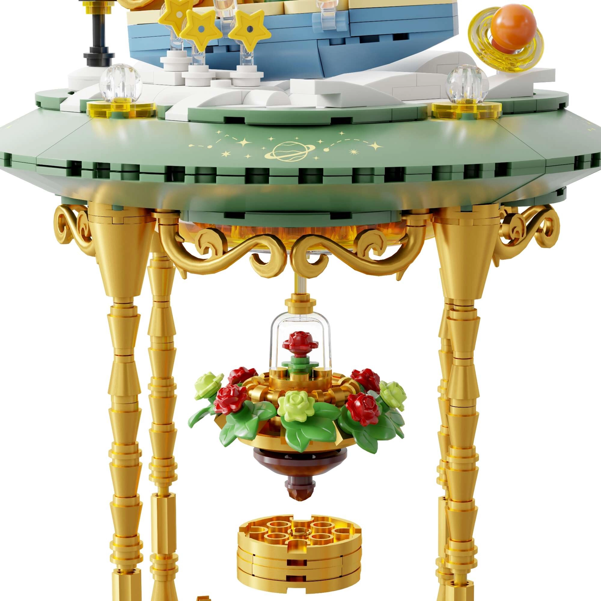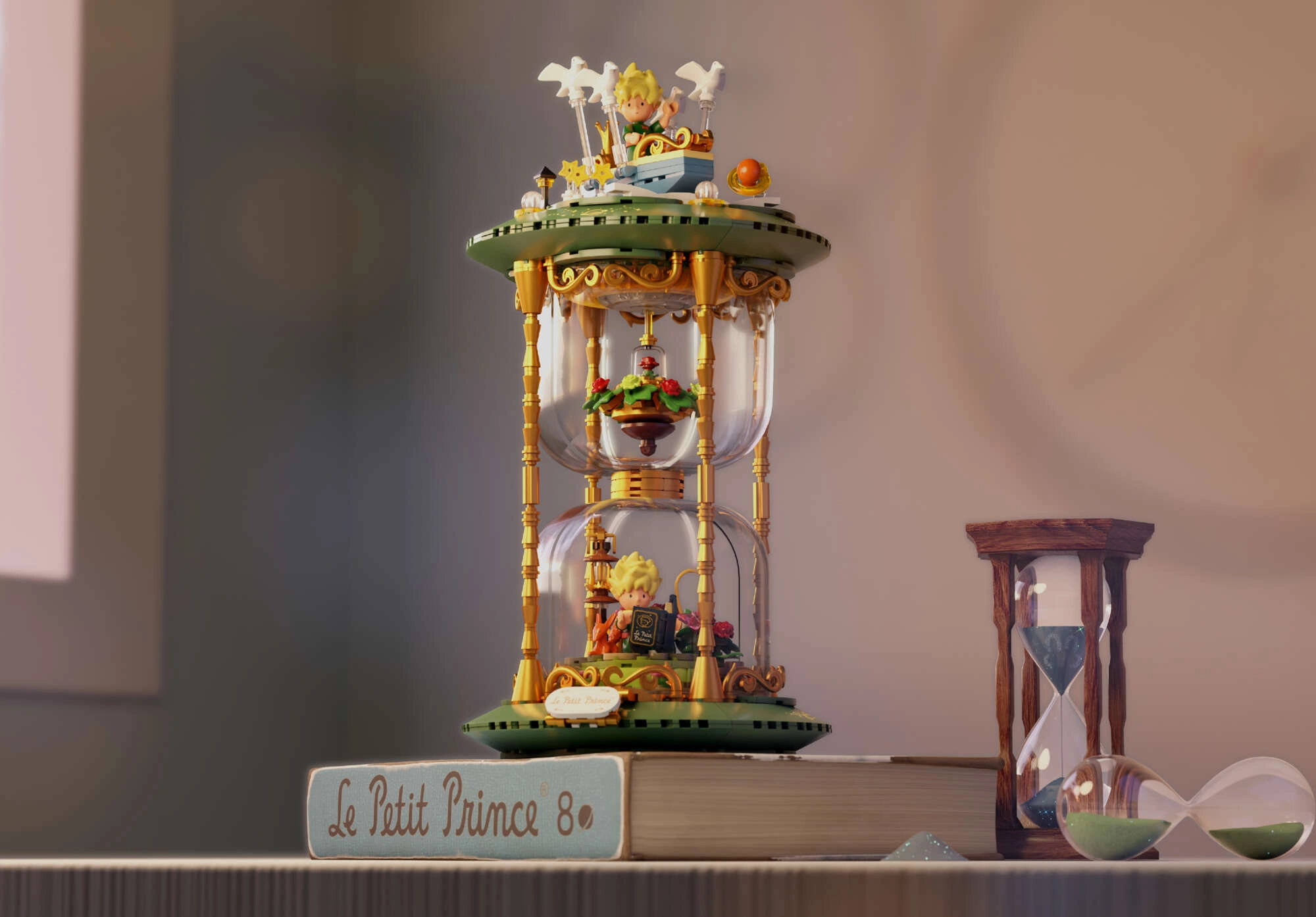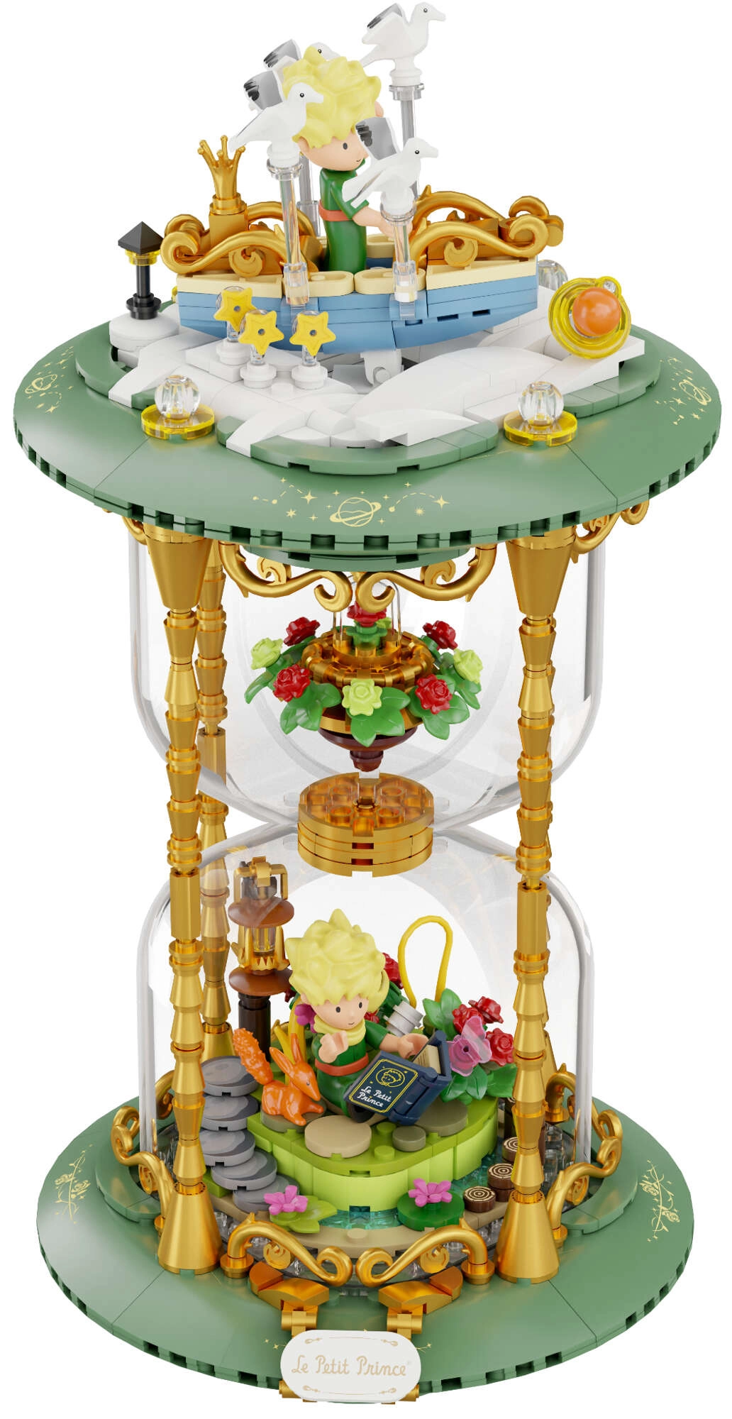 Mini-scenes met de prins, de vos, de roos en sterren vormen een poëtisch verhaal in meerdere lagen. Transparante onderdelen en gouden ornamenten benadrukken het tentoonstellingskarakter van het model.