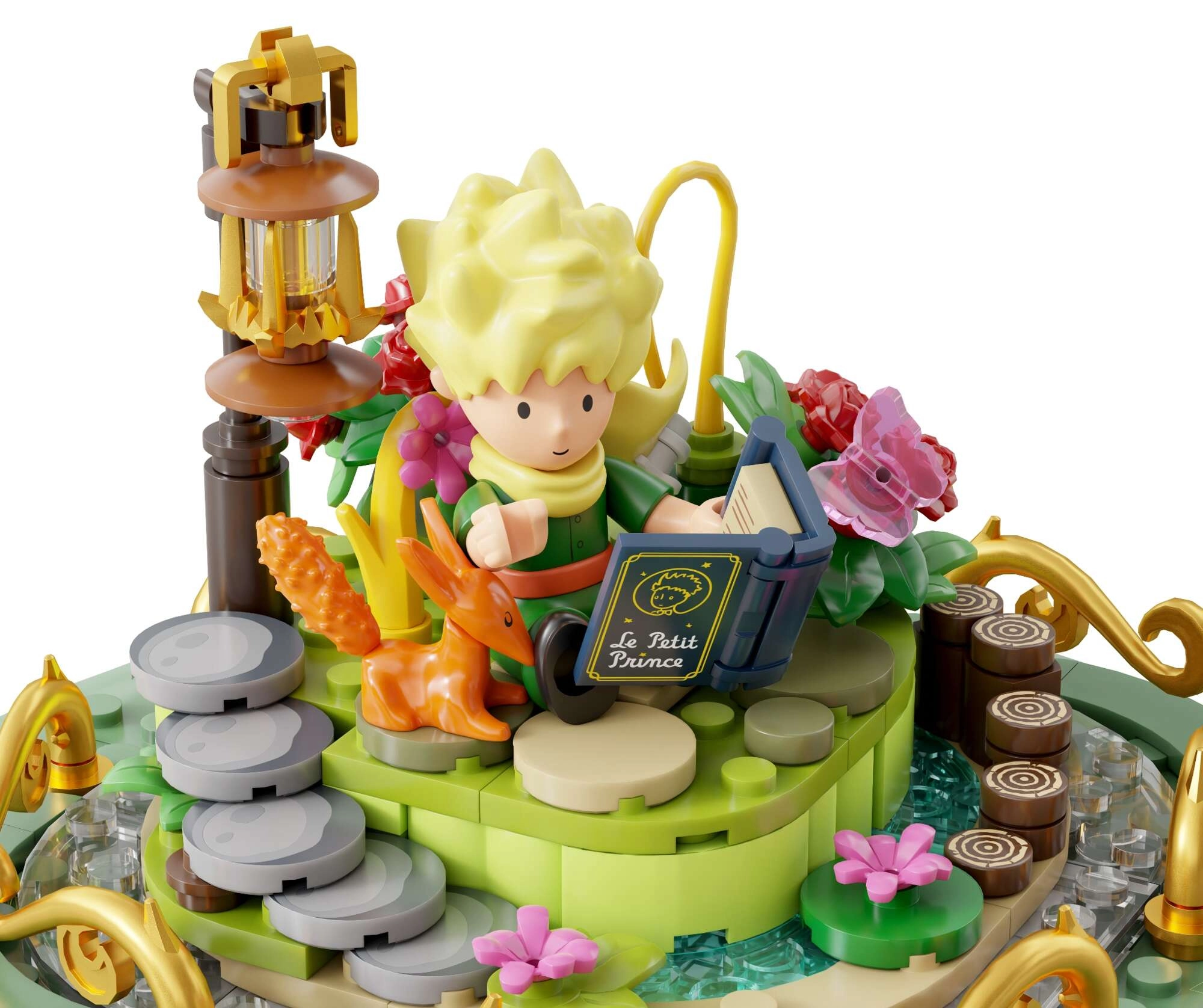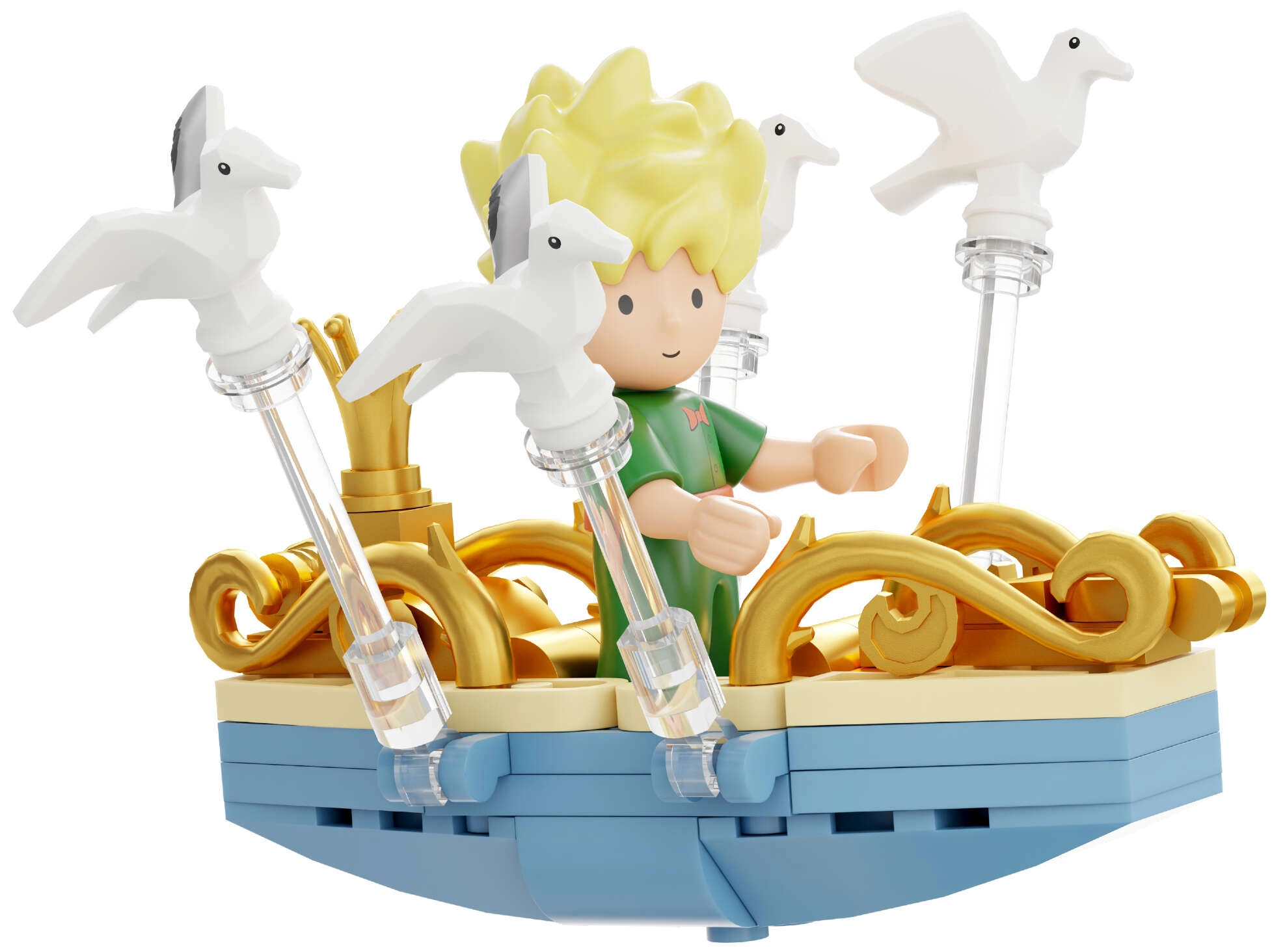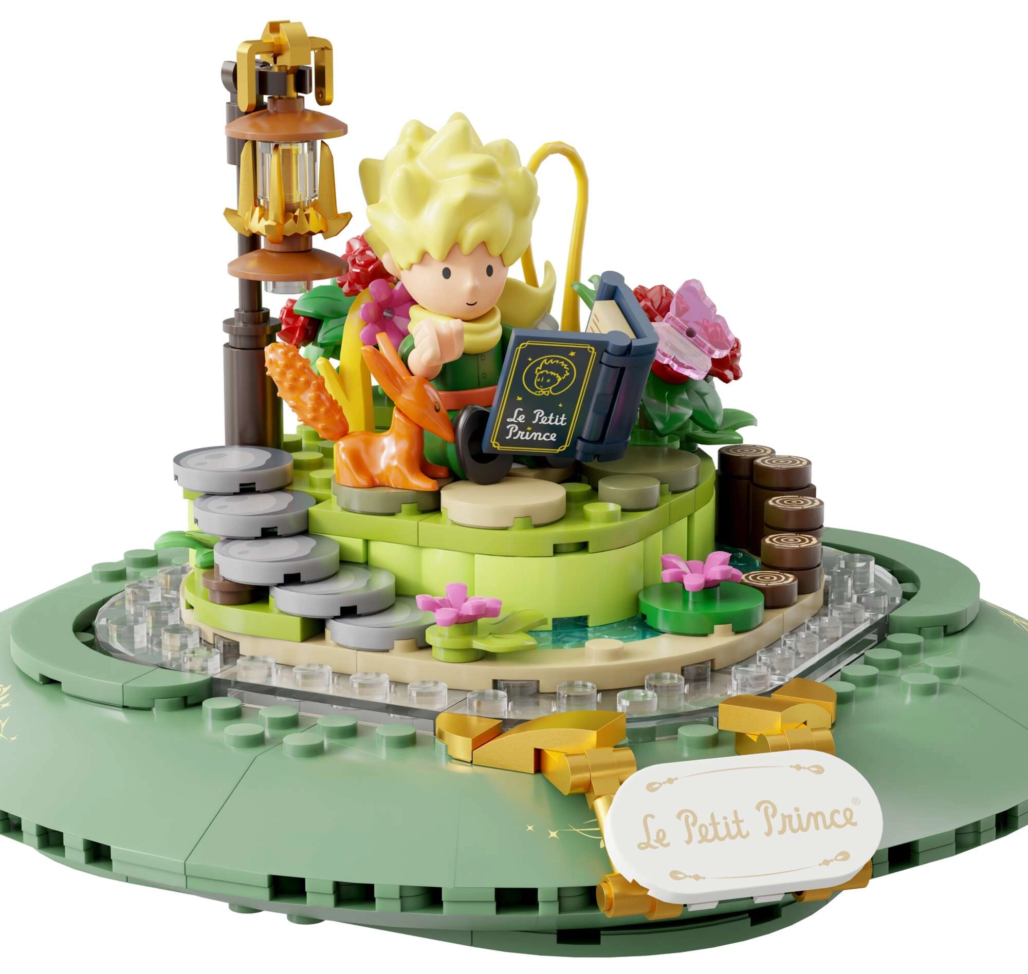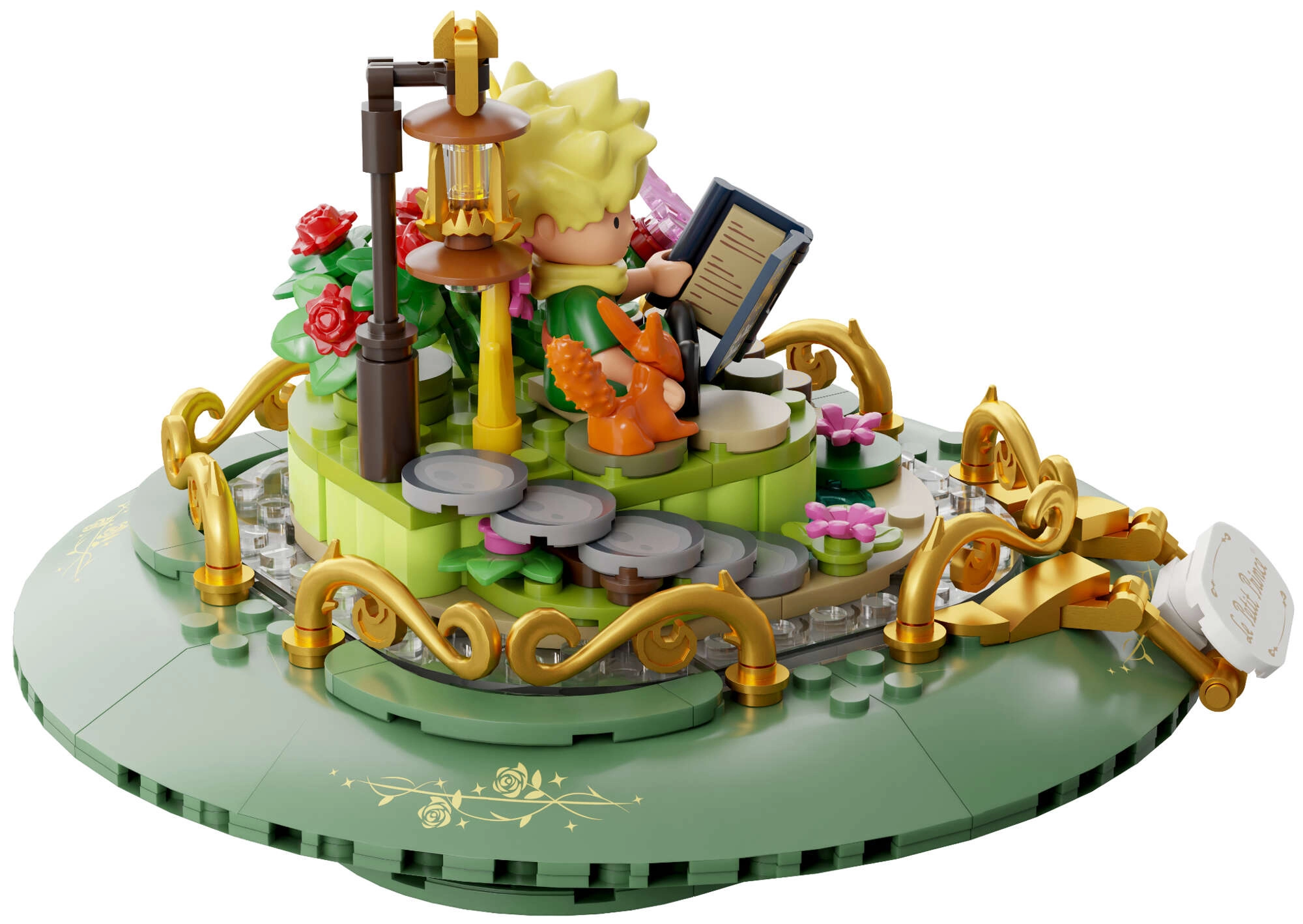 Mini-scenes met de prins, de vos, de roos en sterren vormen een poëtisch verhaal in meerdere lagen. Transparante onderdelen en gouden ornamenten benadrukken het tentoonstellingskarakter van het model.