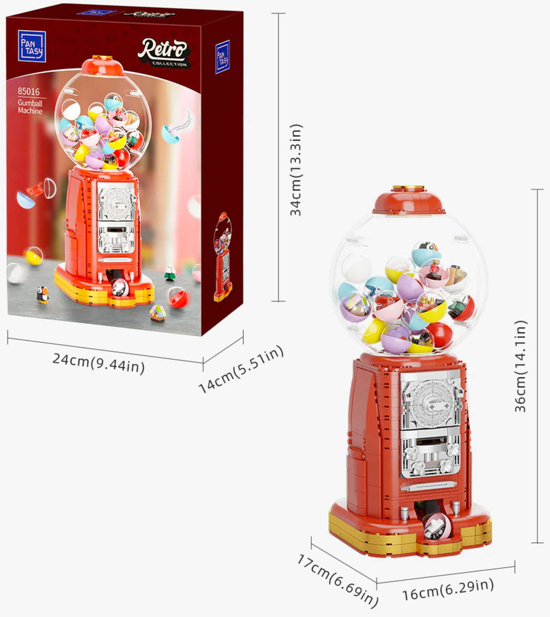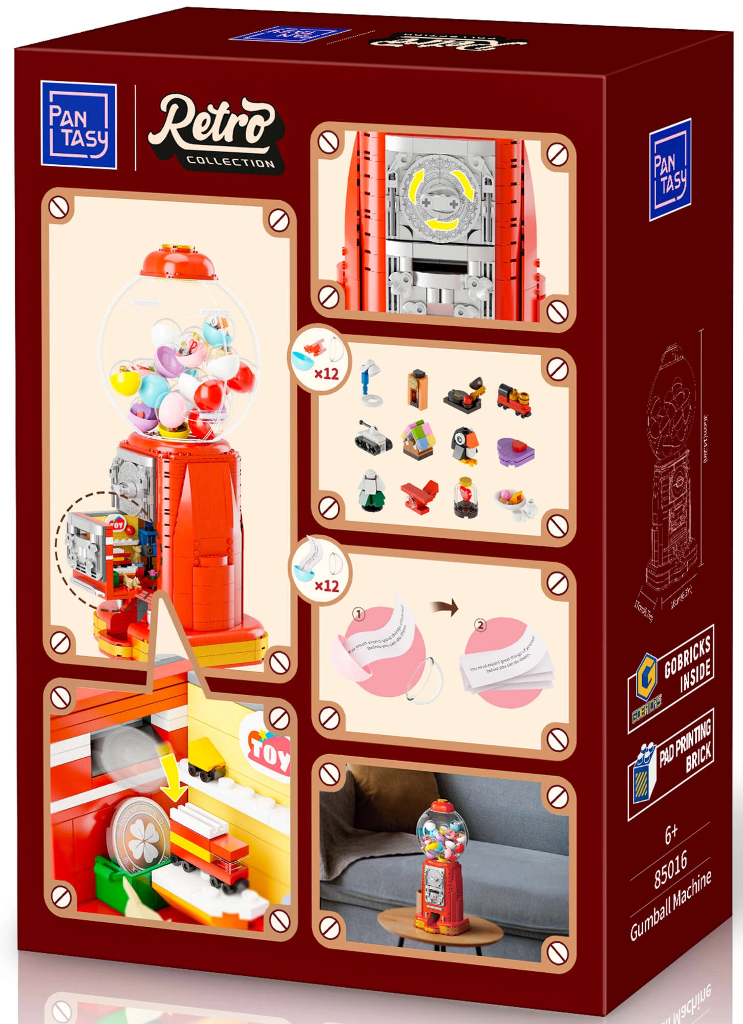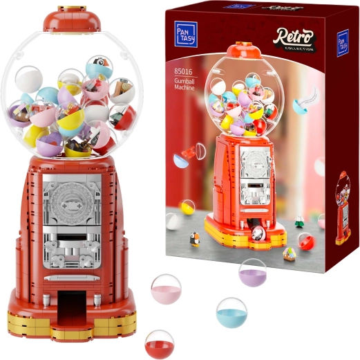 Ontdek de charme van nostalgie met de PANTASY – retro kauwgomballenautomaat met 936 stukjes. Elegante metallic details, een grote glazen bol en een functionerend muntmechanisme met instelbare dosering maken er een geweldig verzamelobject en een originele tafeldecoratie van. In de doos vind je 12 microsteentjes en 12 “gelukswensen” voor gepersonaliseerd plezier, plus bedrukte details zonder stickers en hoogwaardig ABS-kunststof.