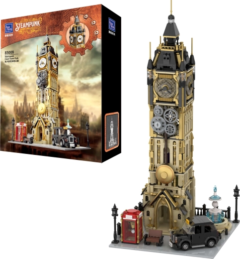 Dit officieel goedgekeurde model uit de Steampunk-collectie neemt bouwers mee naar een industriële vintagewereld. Warme messing-, bruine en donker-metalen tinten creëren de authentieke sfeer van het stoomtijdperk, terwijl de centrale klokkentoren, geplaatst in een schilderachtig park, het middelpunt van elke collectie wordt. De bouwset legt de nadruk op mechanische precisie en visueel detail, ideaal om tentoon te stellen én voor creatief spel.