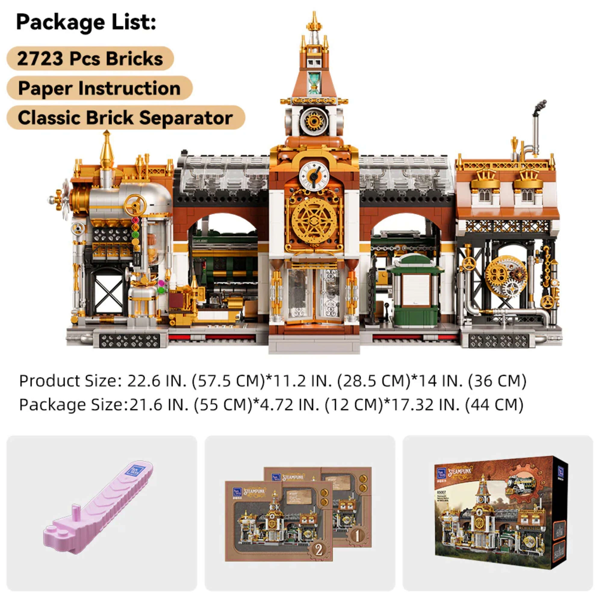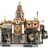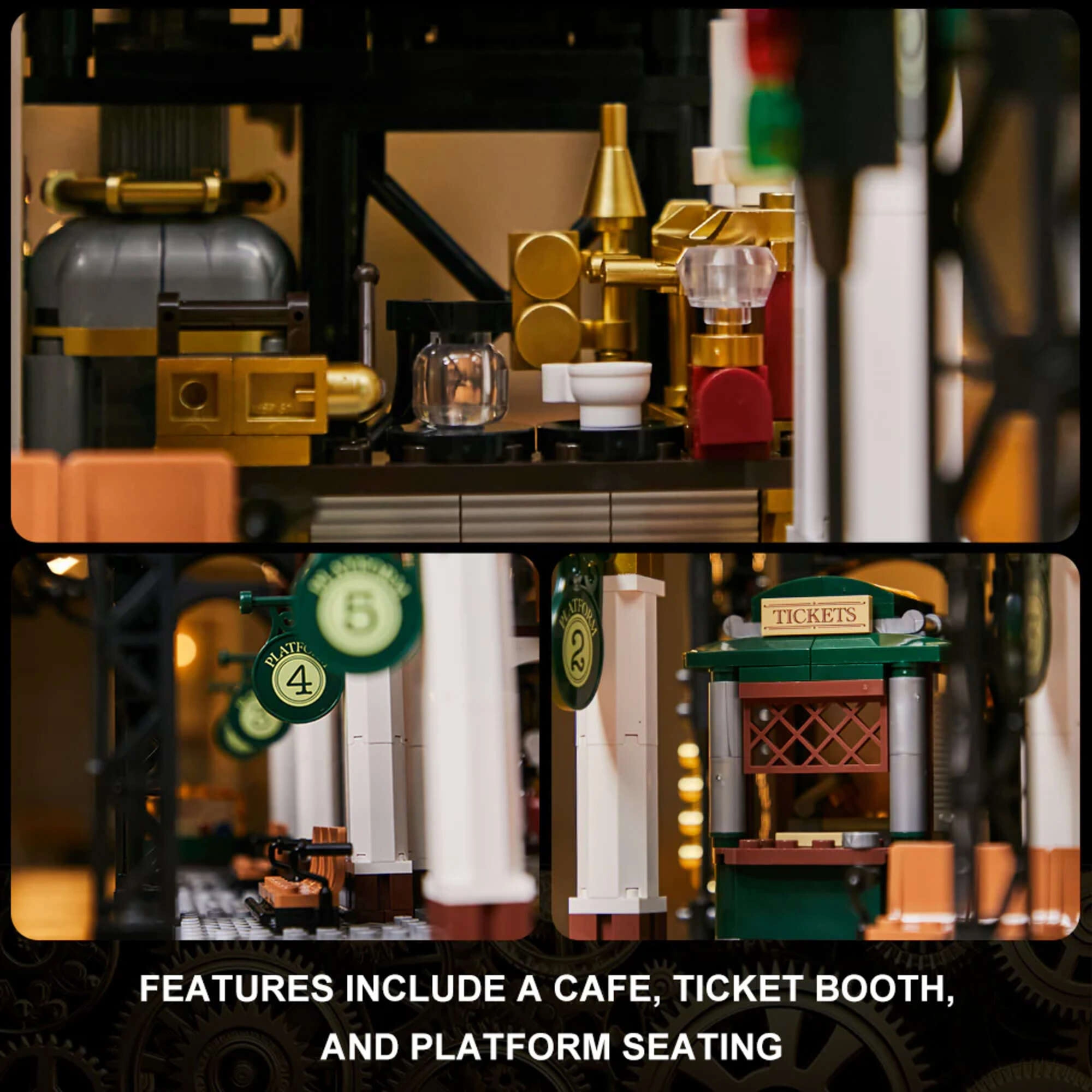 Stap in de sfeer van het stoomtijdperk. Dit gedetailleerde steampunk treinstation combineert messing- en bronstinten met industriële accenten en brengt het authentieke karakter van stoommachines tot leven. Precisieontworpen tandwieloverbrengingen, leidingen en geveldecor maken dit model een opvallend pronkstuk in elke collectie en elk interieur.