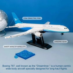 Deze realistische bouwset brengt een icoon van de moderne luchtvaart – de BOEING 787 Dreamliner – als een indrukwekkend showstuk van 55 cm. Nauwkeurig uitgewerkte elementen, waaronder turbofan-motoren, aerodynamische vlakken en een gedetailleerde neus, versterken de authentieke uitstraling. Bedrukte details direct op de onderdelen garanderen een langdurig strak en elegant uiterlijk zonder afbladderende stickers.