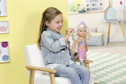 Het lange blonde haar met gekleurde lokken kun je versieren en kammen dankzij de meegeleverde haarband en roze kam. Spelen met de pop ontwikkelt verbeeldingskracht, empathie en verantwoordelijkheidsgevoel – het ideale cadeau voor kleine zeemeerminnen.