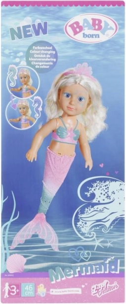 Ontdek de geheimen van de onderwaterwereld met de BABY born zeemeermin-pop. Zodra ze in het water wordt ondergedompeld, zwemt ze elegant en beweegt ze haar kleurrijke vin. Haar speciale effect is de kleurverandering: in koud water verandert roze in turkoois en turkoois in blauw – zo wordt elk bad een magische ervaring.
