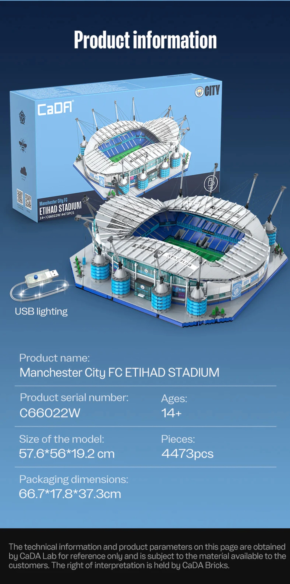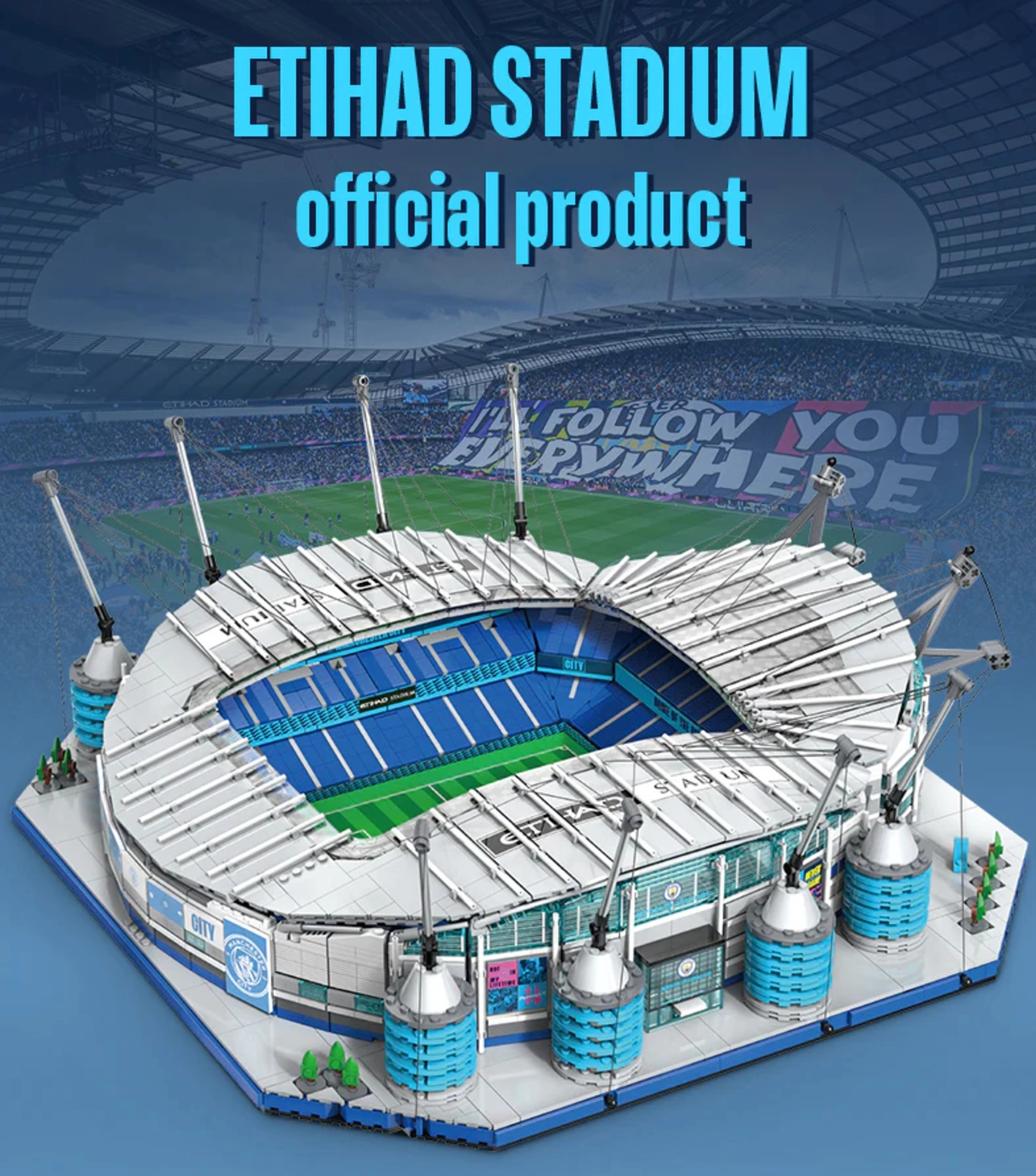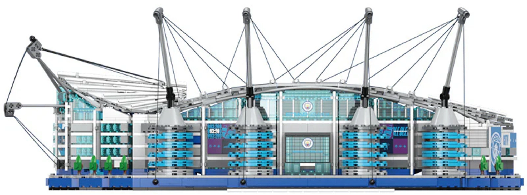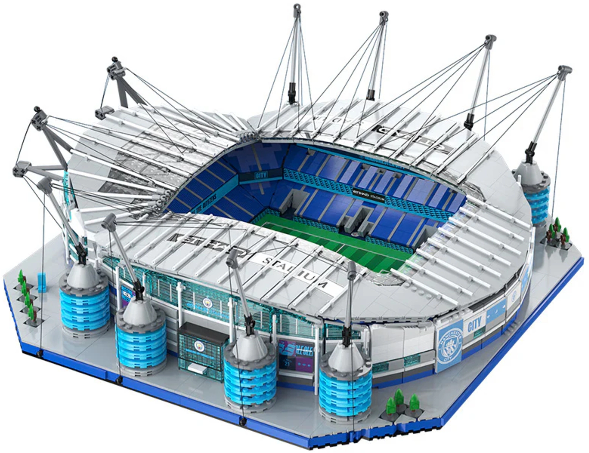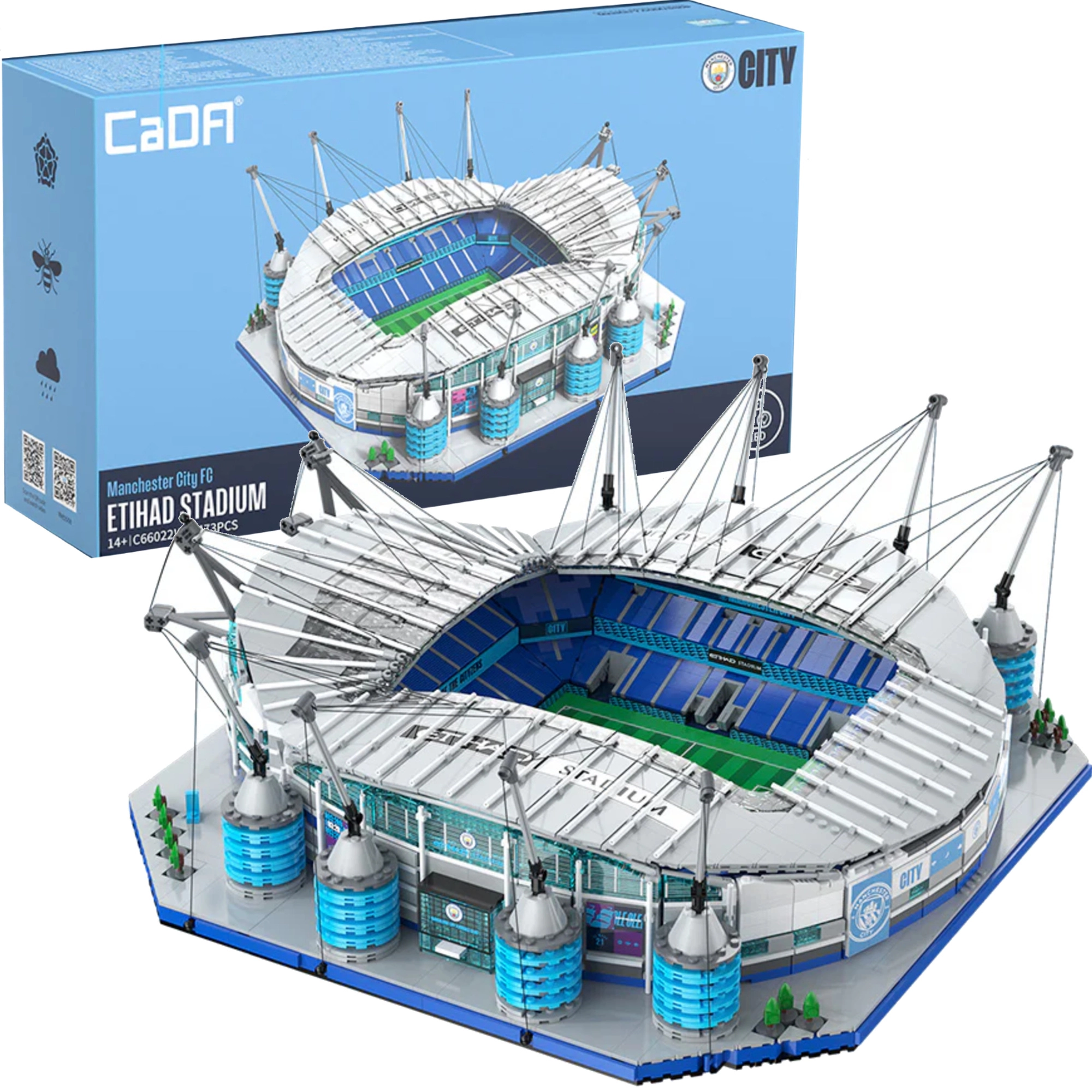 Geniet van een premium bouwervaring met het model van het Etihad Stadium – het iconische thuis van MANCHESTER CITY. De CADA-bouwset focust op authenticiteit en precisie, van het groene speelveld met doelen en de trapsgewijze tribunes tot de karakteristieke torenpylonen met kabels en geveldetails.