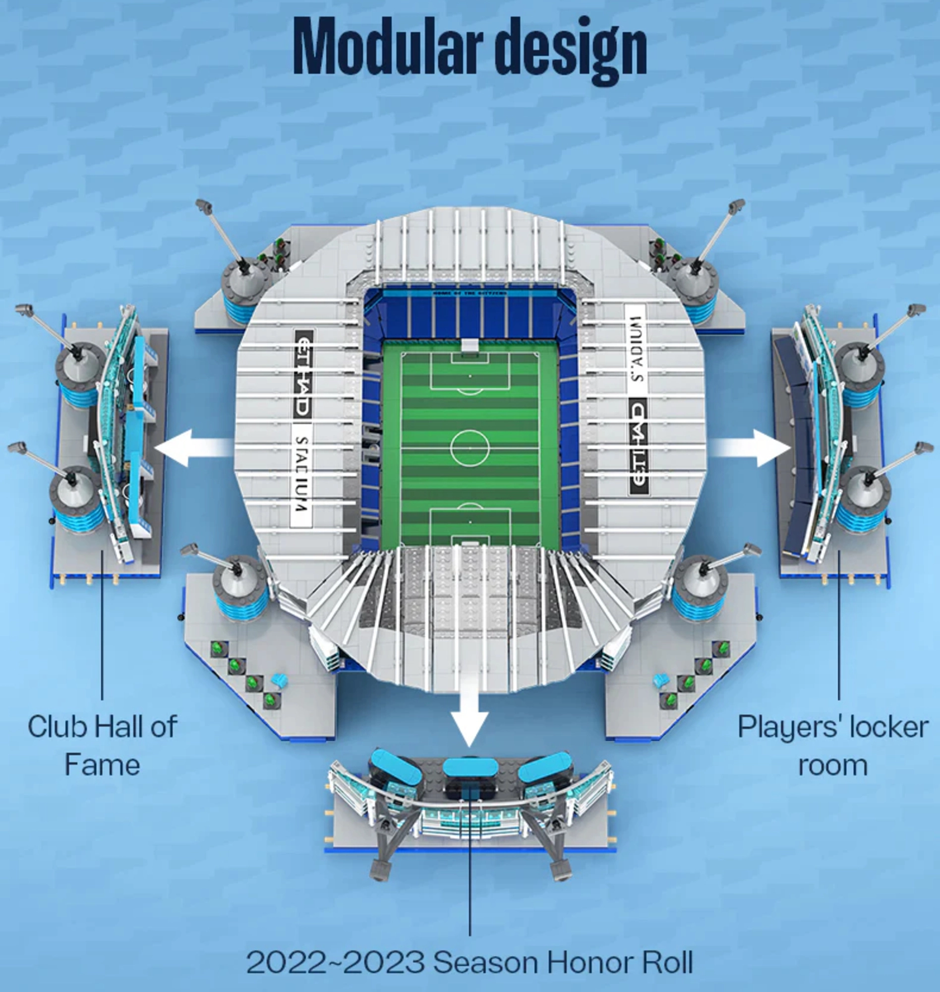 De modulaire opzet laat je apart de kleedkamer en de Hall of Fame bouwen, zodat je het model niet alleen tijdens het bouwen, maar ook bij het bekijken en tentoonstellen kunt waarderen. Dankzij de meegeleverde LED-verlichting (USB) komen de belangrijkste lijnen van het stadion tot hun recht en wordt het model een opvallende decoratie voor elke collectie.