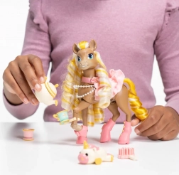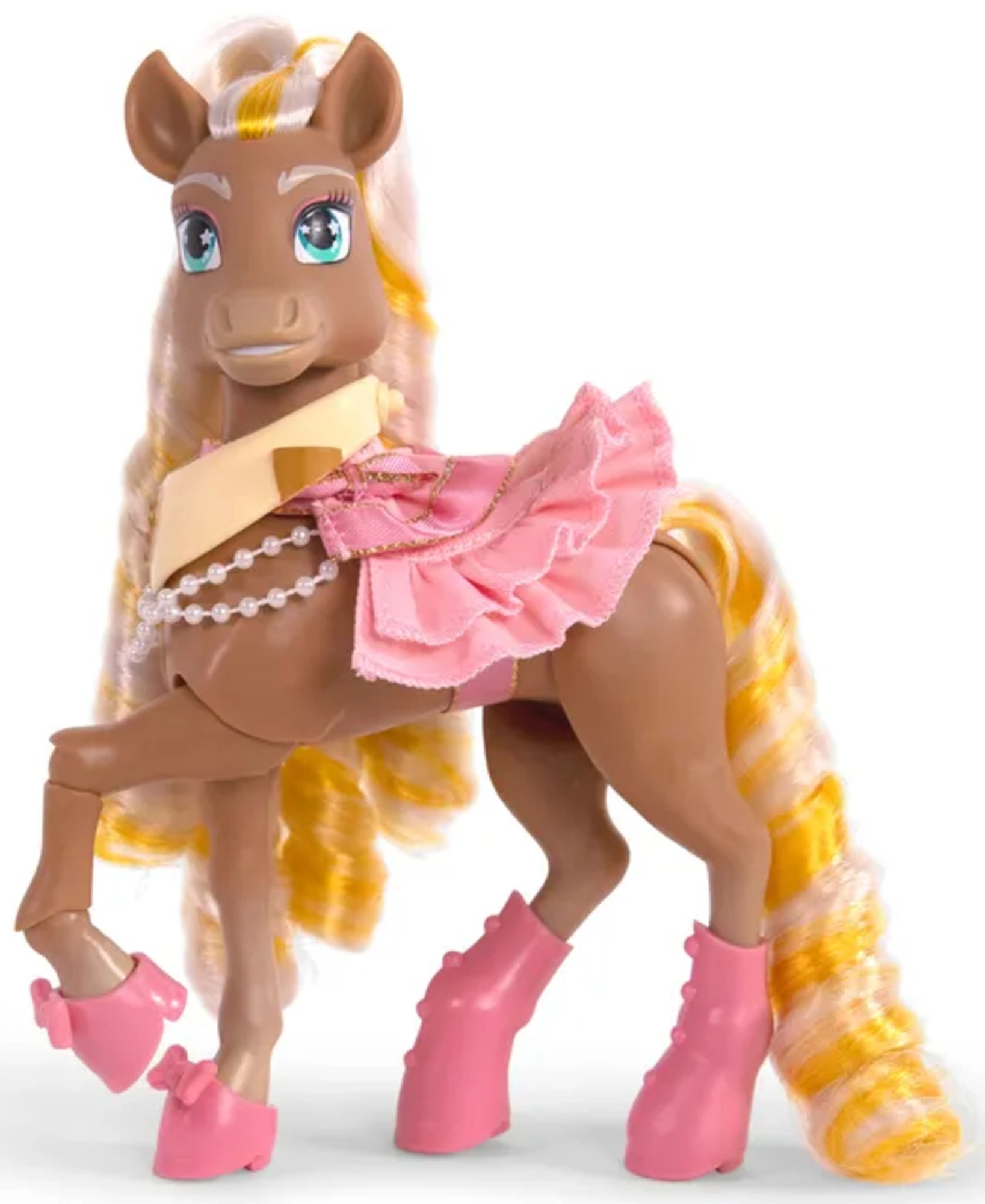 Pony met bewegende ledematen, lange manen met gouden lokken en de mogelijkheid om accessoires vast te houden dankzij hoefijzervormige clips.