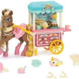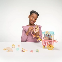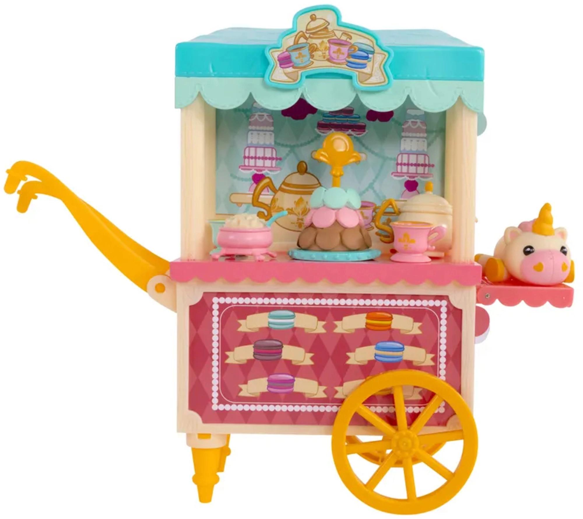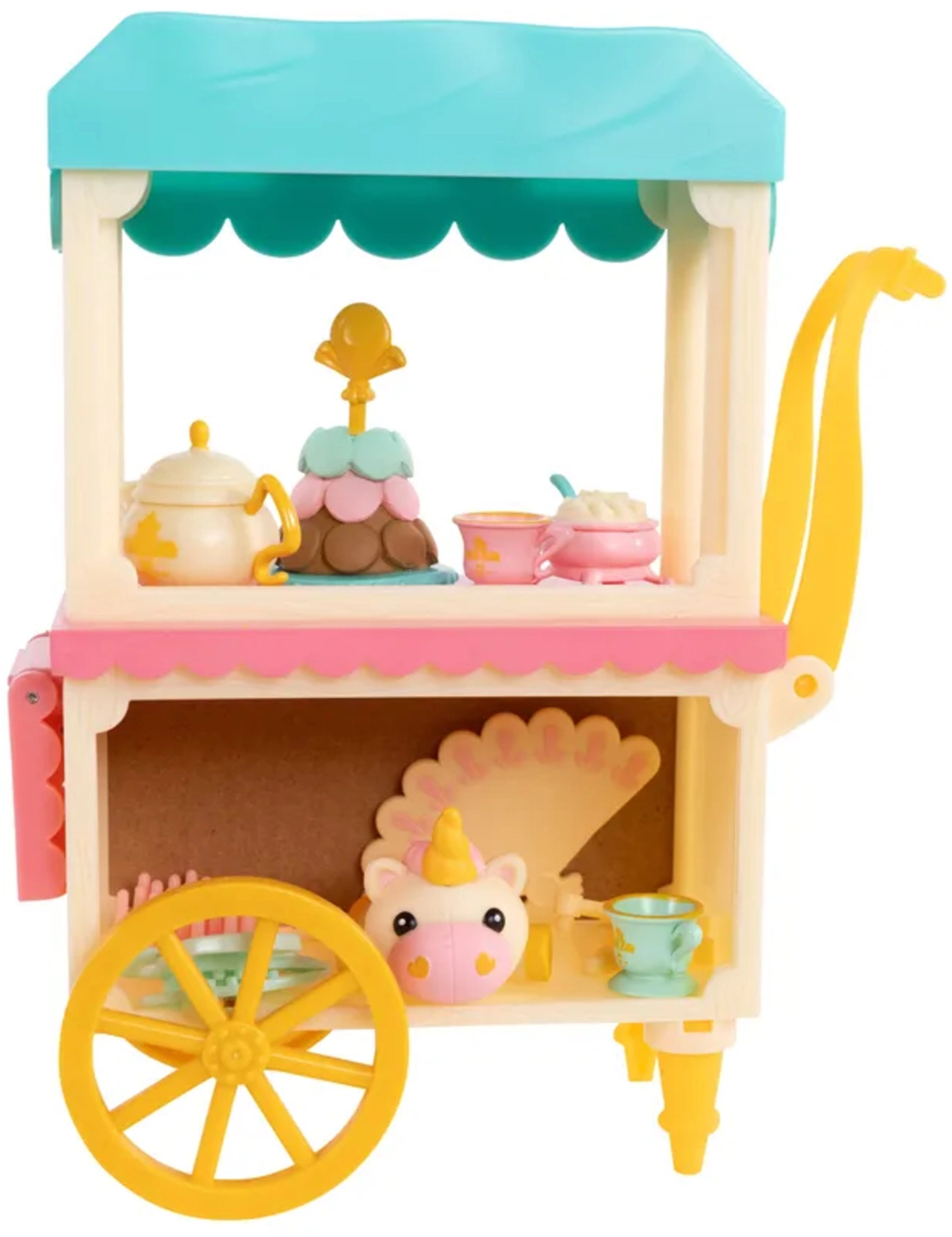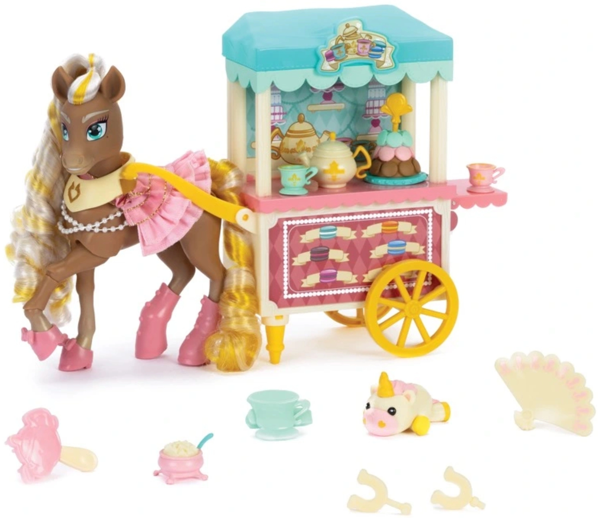 De set bevat een grote Tea & Treats-wagen met twee rijdende wielen, een theepot met thee, kopjes, macarons op een standaard en andere schattige accessoires. De wagen kan met een dissel aan de pony worden gekoppeld voor nog meer speelplezier. Dankzij de hoefijzervormige clips kan Cherie accessoires stevig vasthouden.