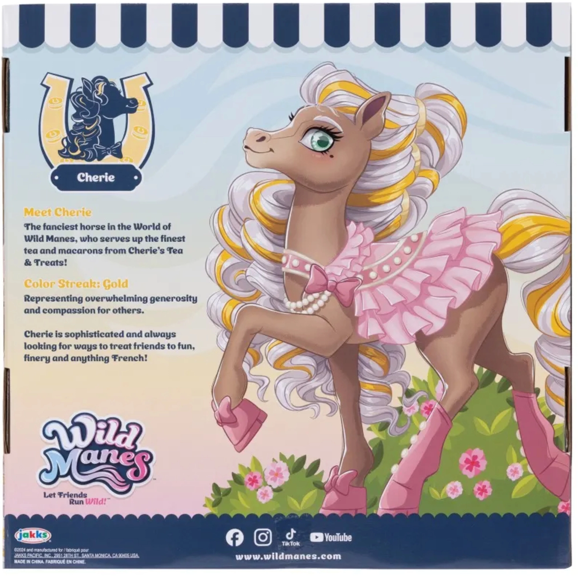 De figuur Cherie in een roze rokje en schoentjes is klaar voor een theefeestje. Dankzij de bewegende benen zet je haar eenvoudig in verschillende poses en speel je favoriete scènes uit de wereld van WILD MANES na. De lange, golvende manen en staart met gouden strepen nodigen uit tot kammen en stylen.