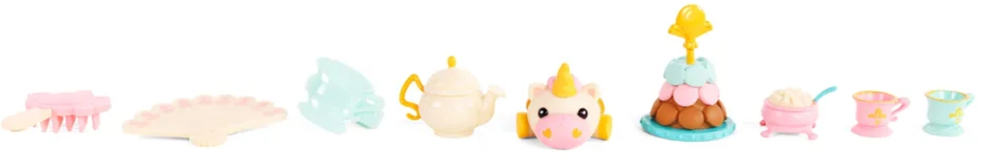 In de verpakking vind je een theeservies, desserts, een kam, een kleine eenhoorn en meer kleine items voor gevarieerde scènes.