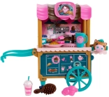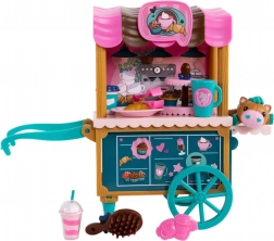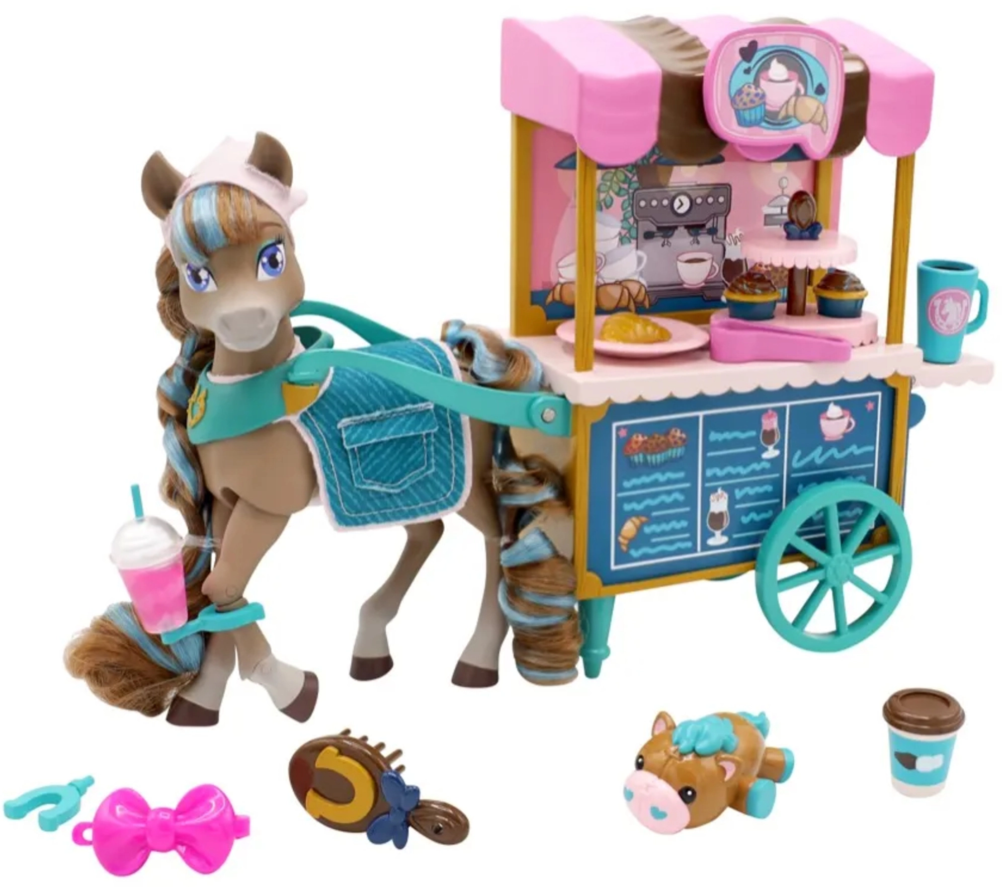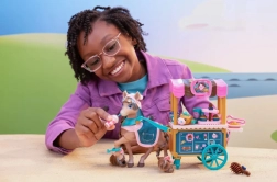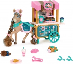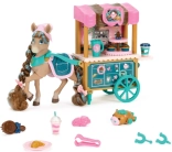 De kar heeft draaibare wieltjes, een handgreep en plankjes voor lekkers, een kleurrijke luifel en cafégraphics. De set bevat ook serveer- en bakaccessoires, een klein huisdiertje en een borstel om de manen te stylen. Alles is ontworpen voor creatief rollenspel, de ontwikkeling van fijne motoriek en sociale interactie.