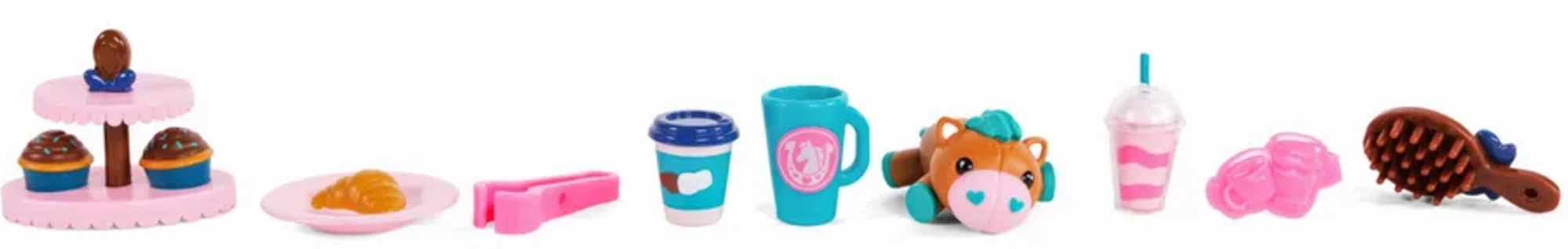 In de doos vind je gebakjes, drankjes, een borstel, een cupcakestandaard en een schattig huisdiertje – alles voor uren speelplezier en ponyverzorging.