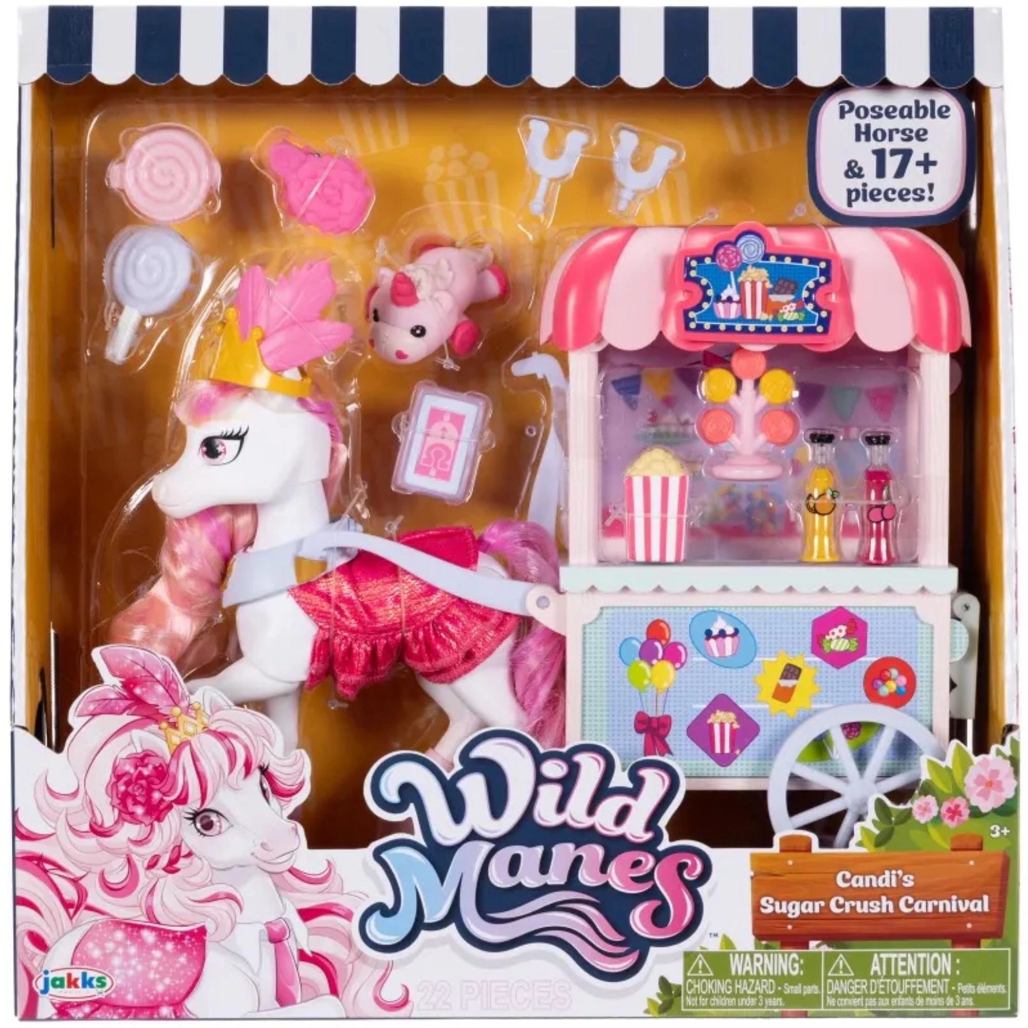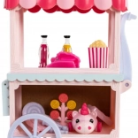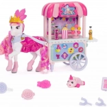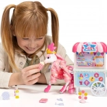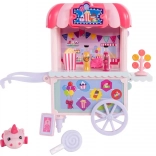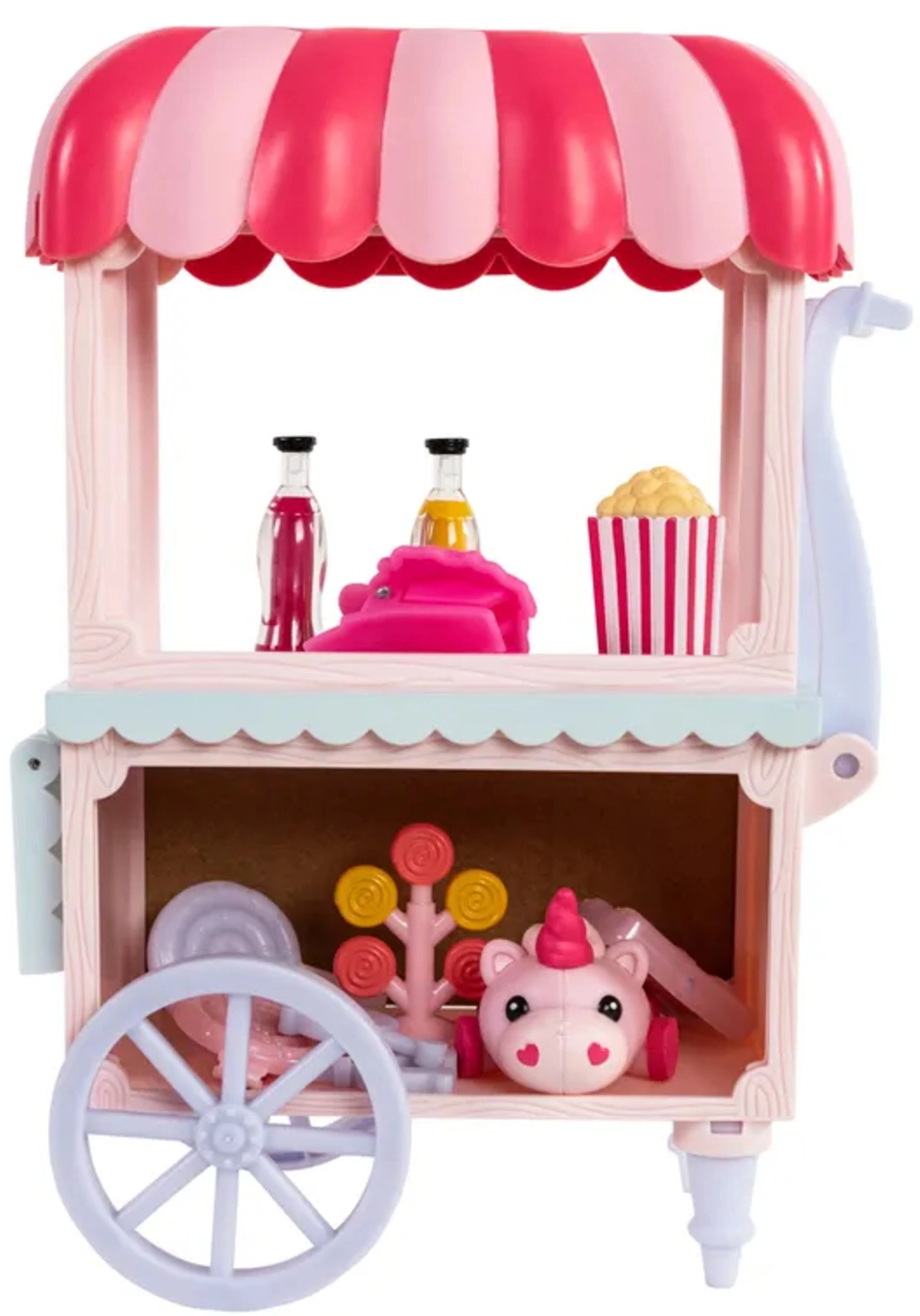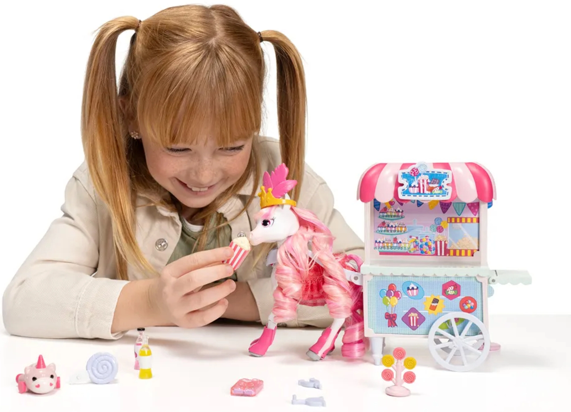 De kleurrijke kraam Sugar Rush Carnival met gestreept dakje en functionele wieltjes is klaar voor de verkoop van popcorn, lolly’s en drankjes. Met behulp van de trekstang/riem kan de kar aan Candi worden gekoppeld voor een zoete rit door het stadje Mane Lane. Ook inbegrepen zijn kleine accessoires voor verzorging en styling – borstel, speldjes en meer.