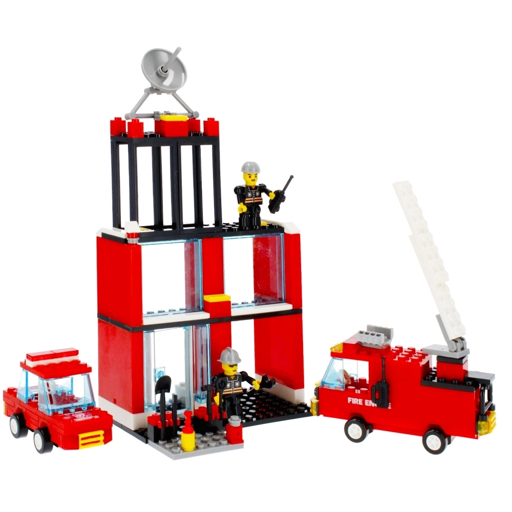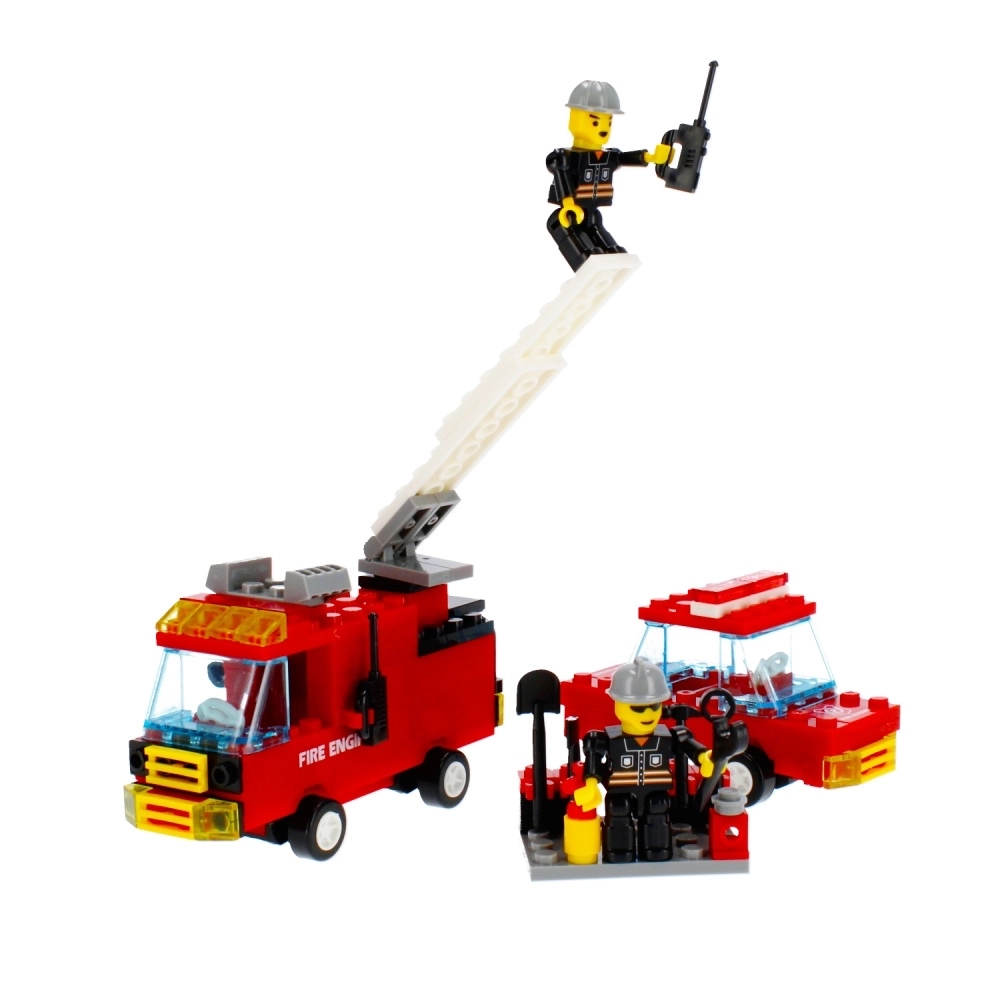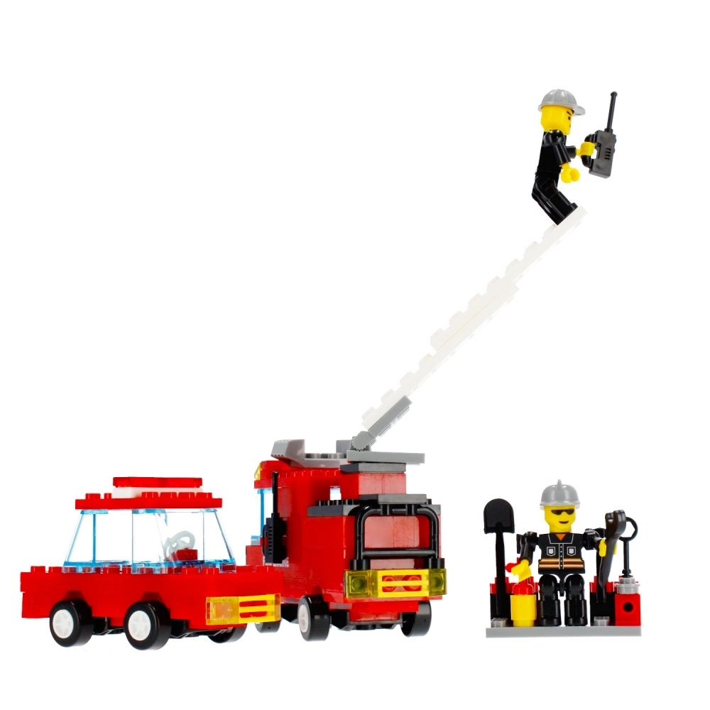 De brandweerwagen met een lange, uitschuifbare ladder bereikt de “vlammen” zelfs op hogere verdiepingen. Minifiguren met helmen, slang en portofoon breiden de speelscenario’s uit.