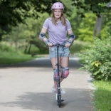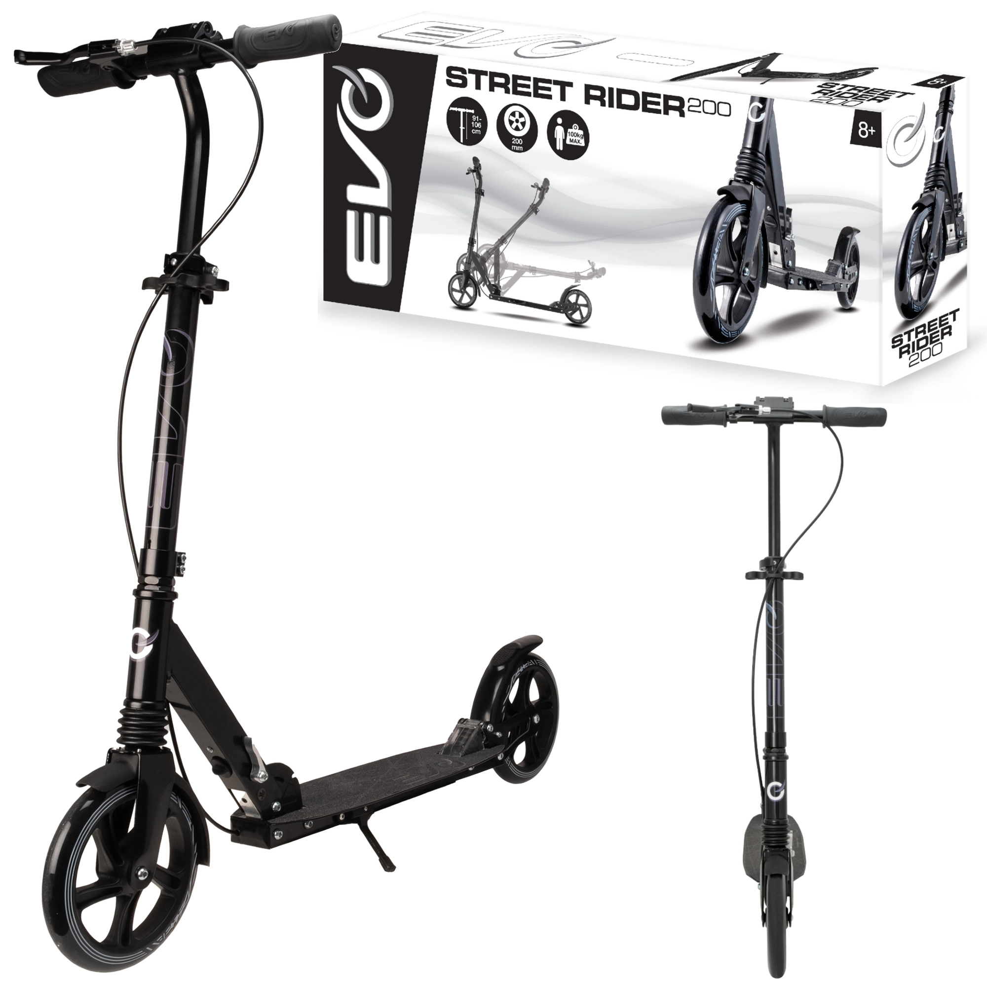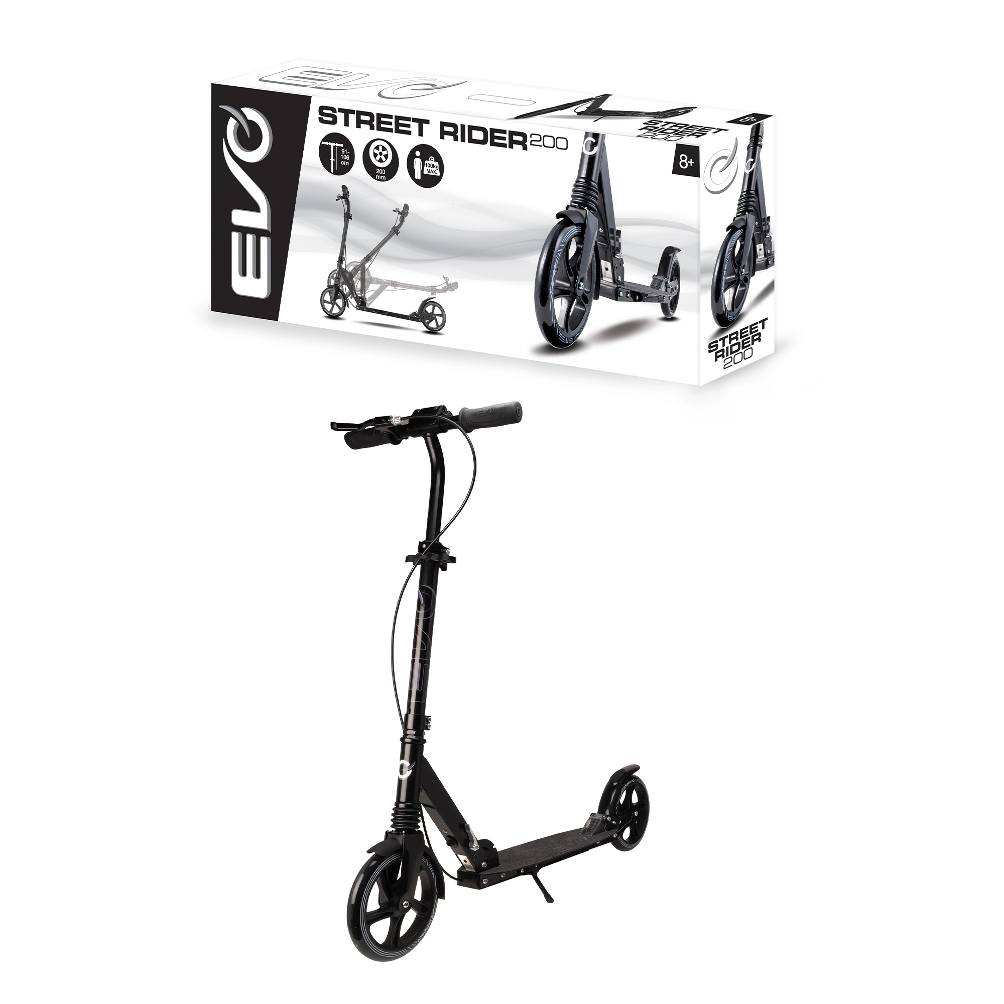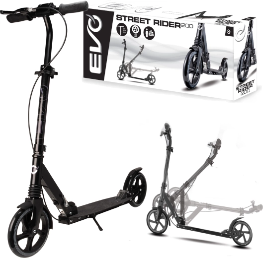 De lichte en duurzame EVO Street Rider 200 step voor rijders vanaf 8 jaar biedt grote 200mm wielen, verminderde rolweerstand dankzij ABEC-7-lagers, vering voor en achter, een opvouwmechanisme voor gemakkelijk dragen en in hoogte verstelbaar stuur. Voor veilig remmen zorgen zowel de achterste voetrem als de voorste handrem, extra stabiliteit biedt het antislip deck en de praktische geïntegreerde standaard.