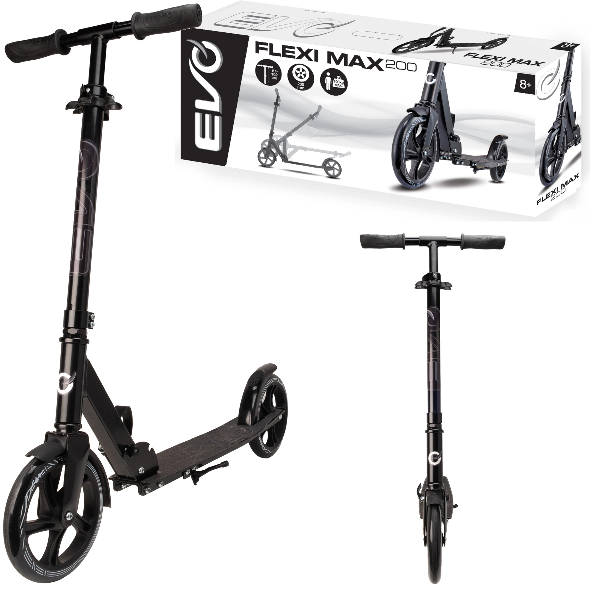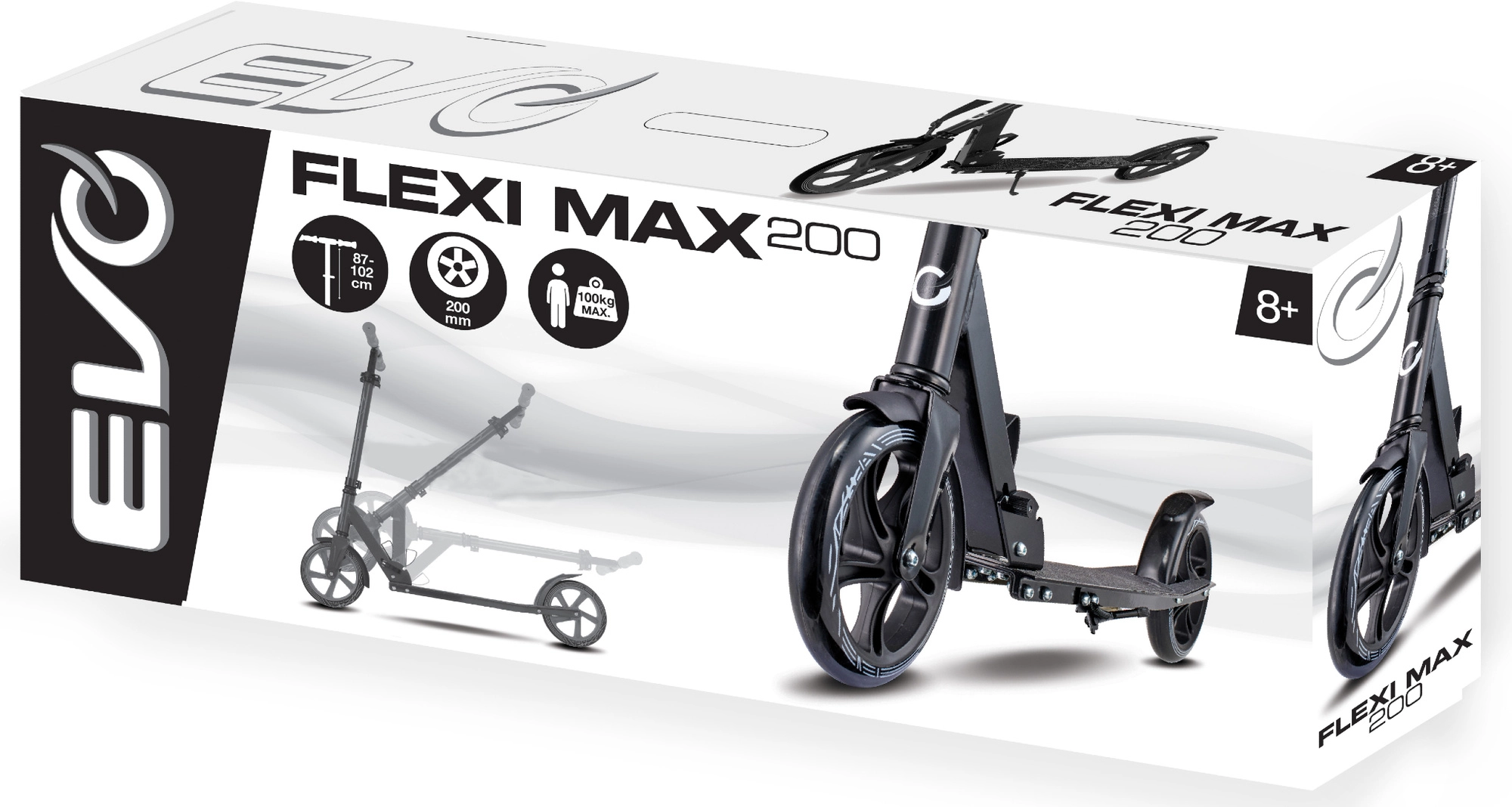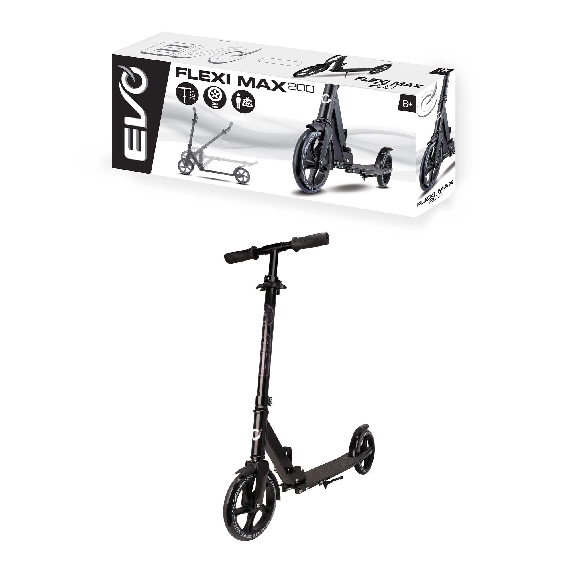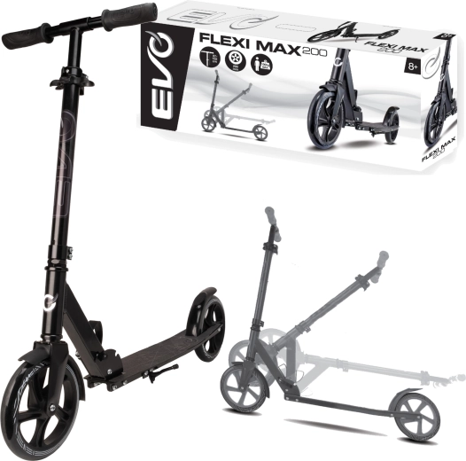 De EVO Flexi Max 200 is een betrouwbare stadsstep, ontworpen voor comfortabel woon-werkverkeer en vrijetijdsritten. De grote 200 mm wielen met ABEC-7-lagers zorgen voor minder weerstand en sneller optrekken, terwijl rubberen TPR-grips een zekere, slipvrije greep bieden. De in hoogte verstelbare stuurpen (ca. 87–102 cm) groeit mee met de rijder en de inklapbare standaard maakt parkeren eenvoudig.