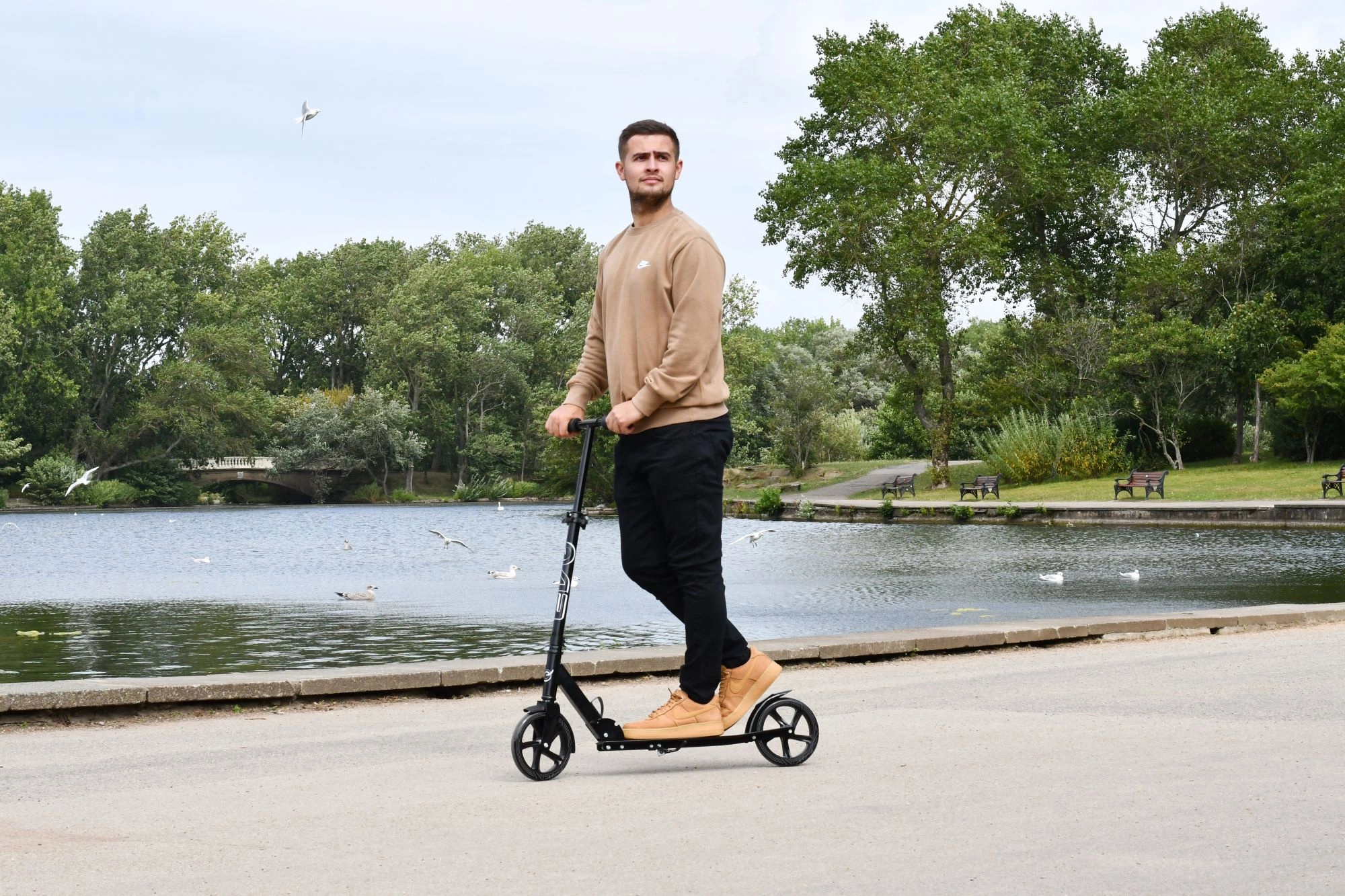 Je klapt de step in een handomdraai in, zet hem neer op de standaard en draagt hem comfortabel dankzij de verstelbare riem.
