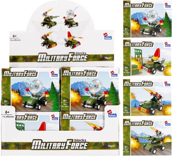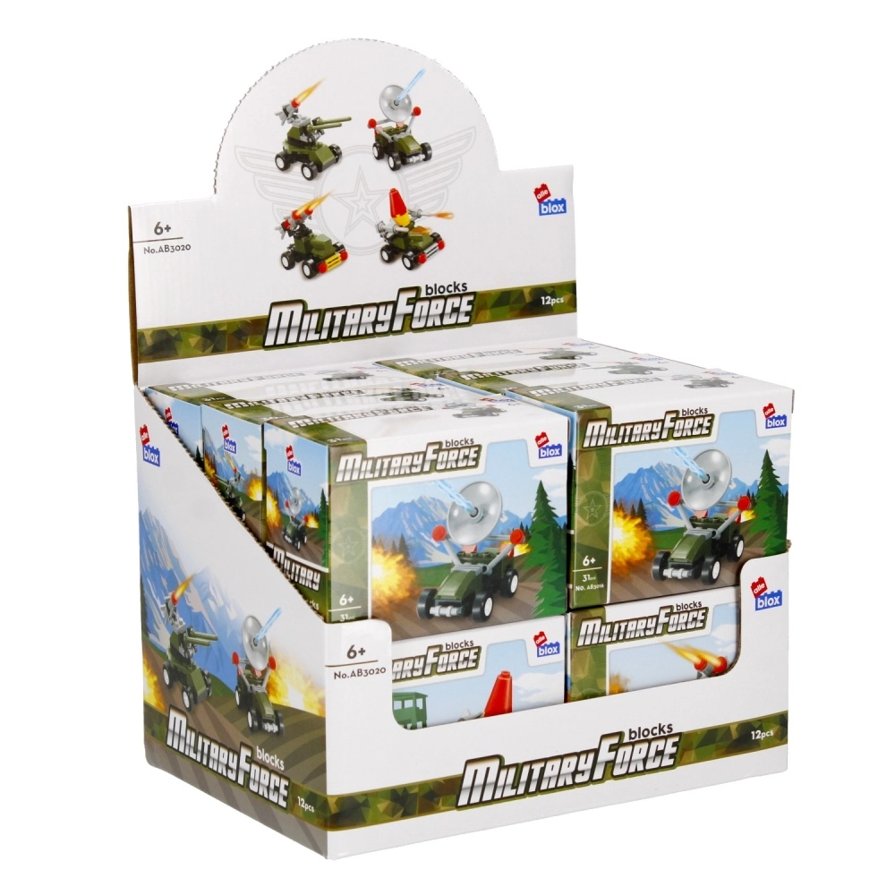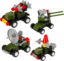 Ontdek compacte bouwsets van militaire voertuigen waarmee kinderen eenvoudig een raketwerper, radarvoertuig of luchtafweerwagen bouwen. De onderdelen zijn compatibel binnen de set, de voertuigen hebben functionerende wielen, draaibare torens of radars en zijn gemakkelijk te monteren met de bijgevoegde handleiding.