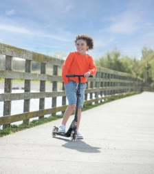 Het praktische opvouwbare en in hoogte verstelbare stuur (75–80 cm) past zich gemakkelijk aan de lichaamslengte van het kind aan. De voetrem geïntegreerd in het achterspatbord geeft vertrouwen bij het remmen, terwijl rubberen wielen met ABEC-5 lagers een stille en soepele rit op vlakke ondergronden garanderen.