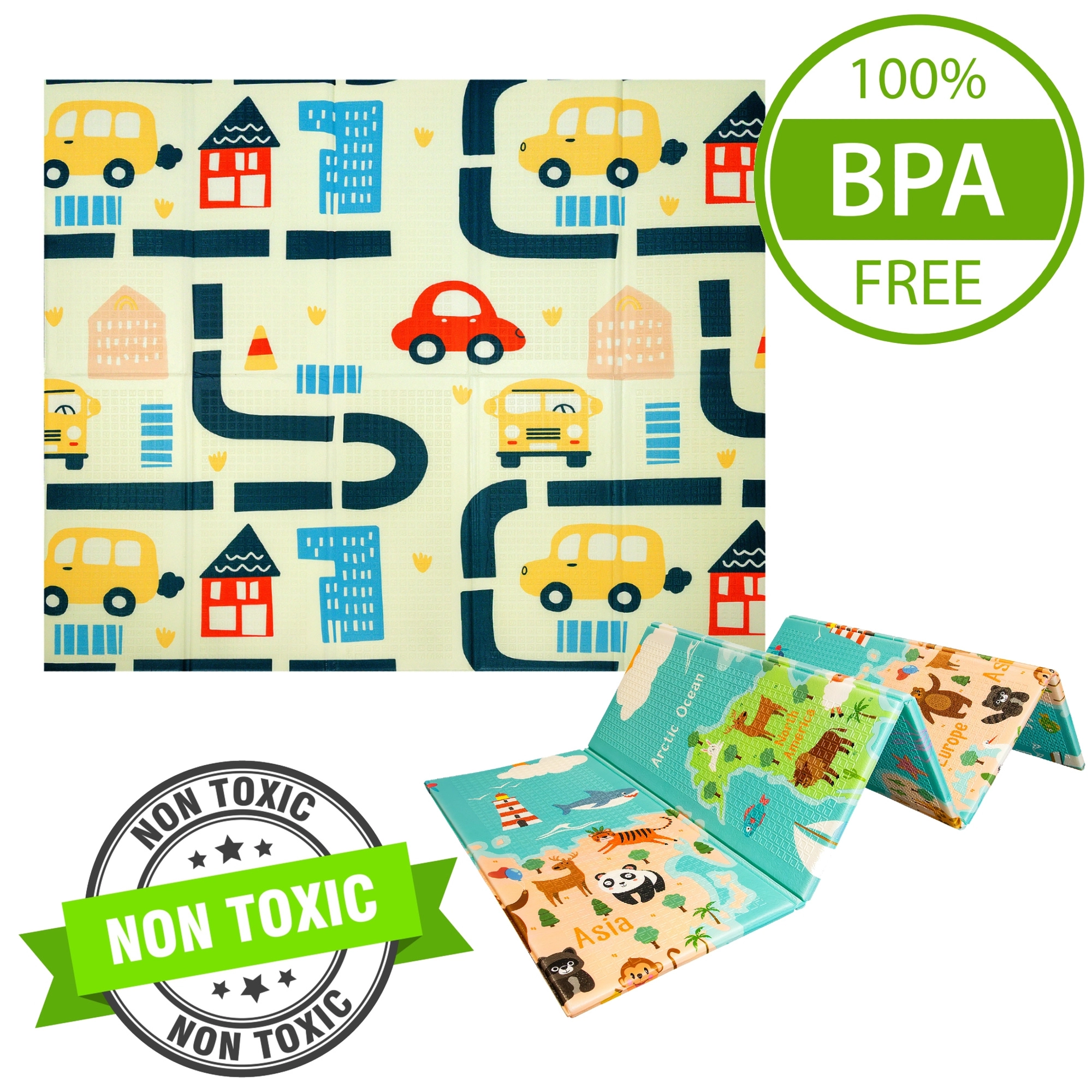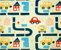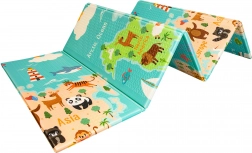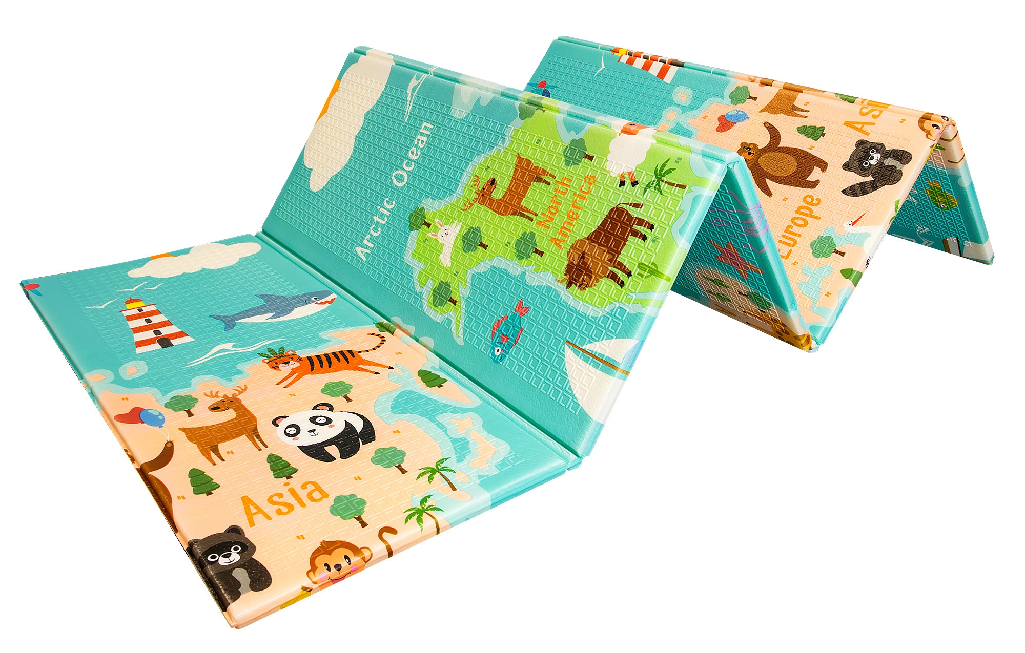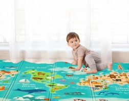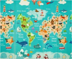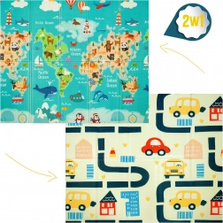 Het design stimuleert leren door te spelen: de wereldkaart met oceanen, continenten en dieren wekt kinderlijke nieuwsgierigheid naar geografie, terwijl de straatjes met autootjes en gebouwen de verbeelding en creativiteit versterken. De mat is waterdicht en hygiënisch – afnemen met een vochtige doek is voldoende, neemt geen stof op en is geschikt voor allergiepatiënten.