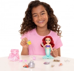 De geliefde heldin uit de DISNEY-animatie De Kleine Zeemeermin komt in een schattige 16 cm uitvoering. Ariel heeft beweegbare armen, hoofd en heupen, zodat ze gemakkelijk verschillende poses kan aannemen. De set bevat uitgebreide accessoires voor spelen in zee en op het land: verwisselbare staart en top, roze jurk, schoentjes, tiara, kam – “dinglehopper”, schelptas, zilveren serveercloche en kleine figuurtjes van haar vriendjes.