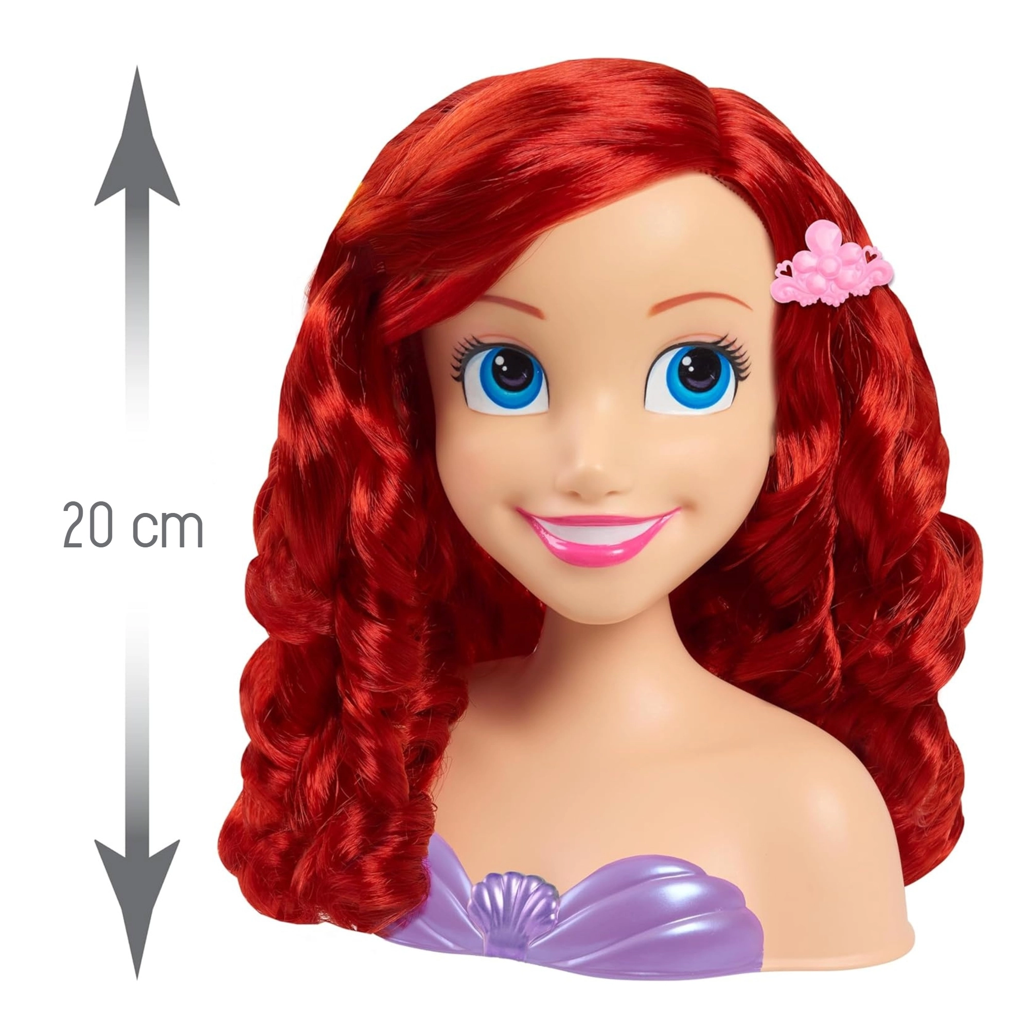 De DISNEY Prinses Ariel stylingskop beeldt de geliefde zeemeermin natuurgetrouw uit met blauwe ogen en lange, krullende rode haren. De stabiele kunststof buste met paarse schelptop maakt stylen gemakkelijk en houdt de kop stevig op zijn plaats, zodat kinderen volop kunnen genieten van het kappersspel.