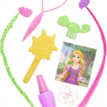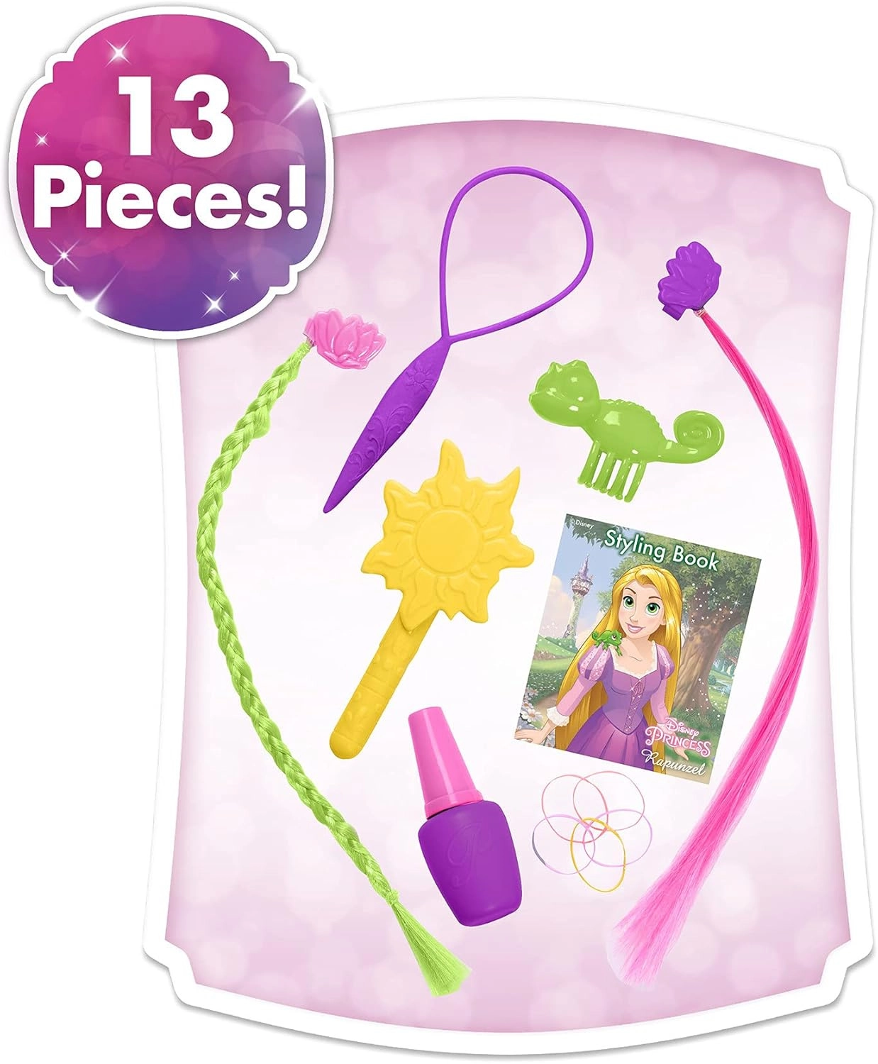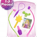 De set bevat een 13-delige selectie handige tools: een borstel, een tool voor kapsels, gekleurde elastiekjes, clips met lokken, thematische speldjes en een klein ideeënboekje voor snelle inspiratie. De accessoires zijn te gebruiken op het hoofd van Rapunzel én in het eigen haar van het kind.