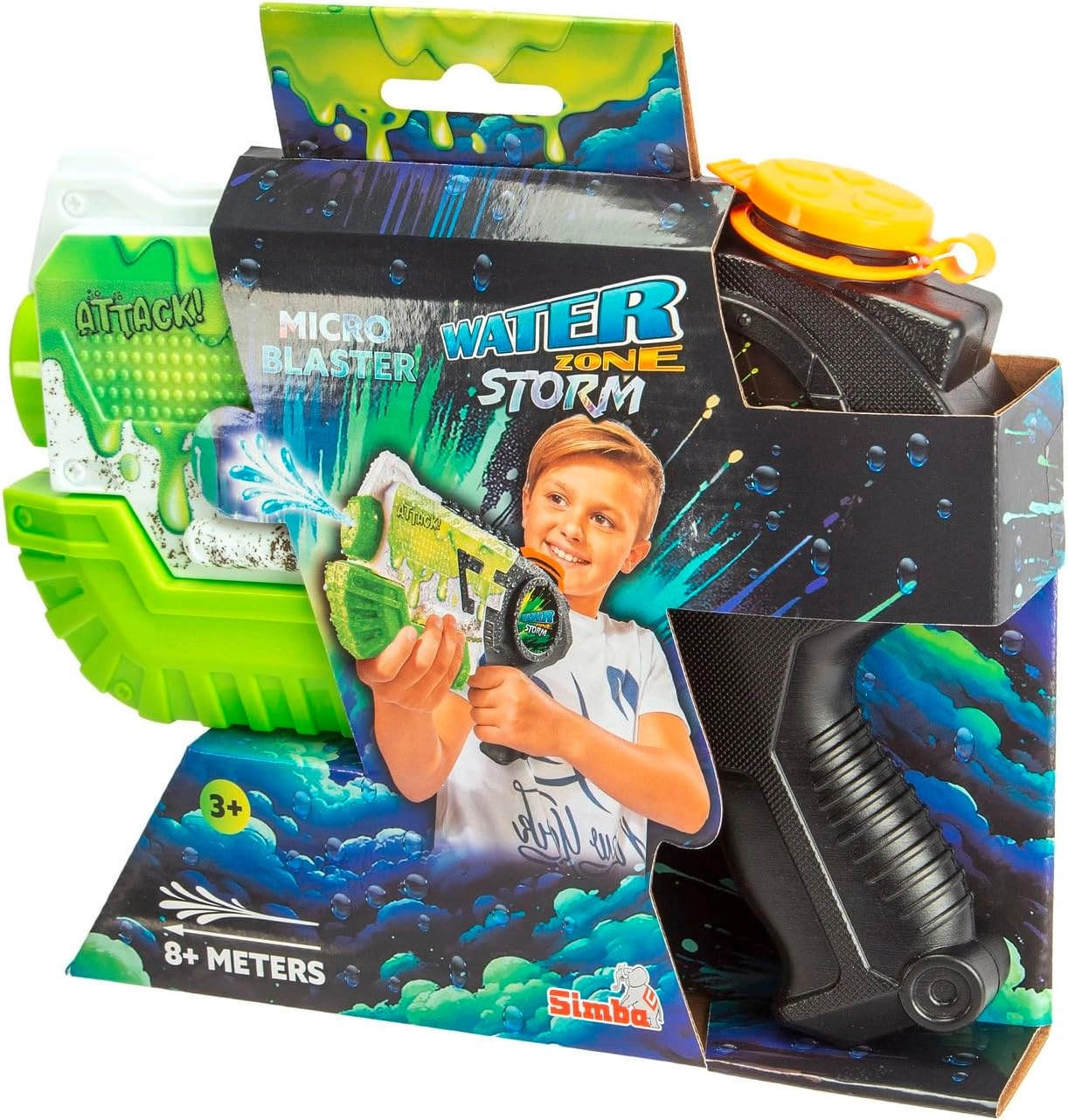 De compacte waterpistool SIMBA Water Zone Storm Micro Blaster is ideaal voor zomerse gevechten. Dankzij het lichte design, de ergonomische greep en het bereik tot 8 m beleven kinderen volop actie. De reservoir van 400 ml en het pompmechanisme zorgen voor lang speelplezier zonder vaak bij te vullen.