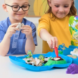 Deze creatieve set met kinetisch zand geeft kinderen een realistische ervaring van T‑Rex-fossielen opgraven. Dankzij de verdeelde tray-bak hebben kinderen alles overzichtelijk bij de hand, kunnen ze zandkleuren mengen, het landschap vormen en het dinoskelet samenstellen als afdruk of mal. Het zand voelt prettig aan, behoudt zijn vorm en laat geen rommel achter.
