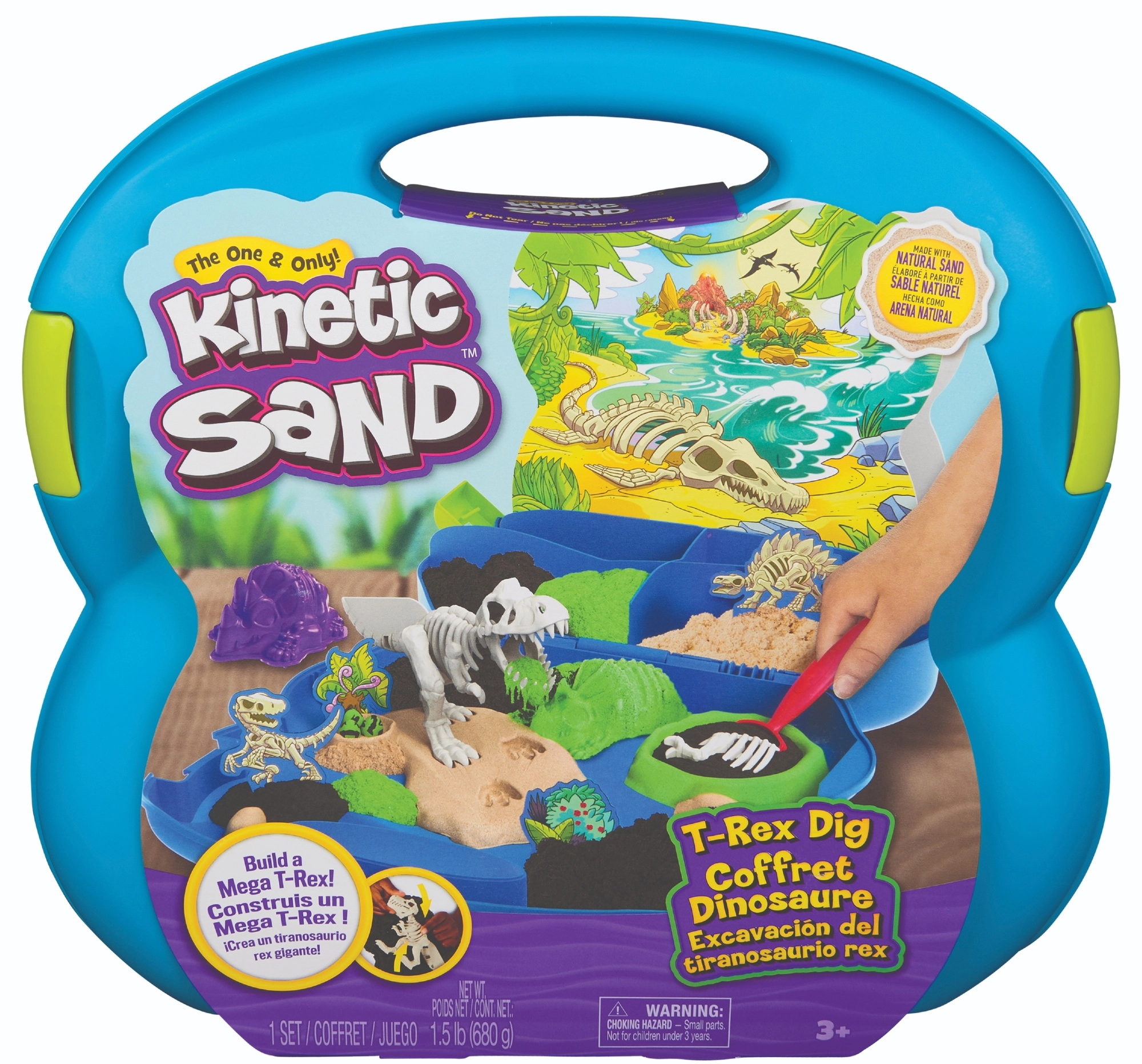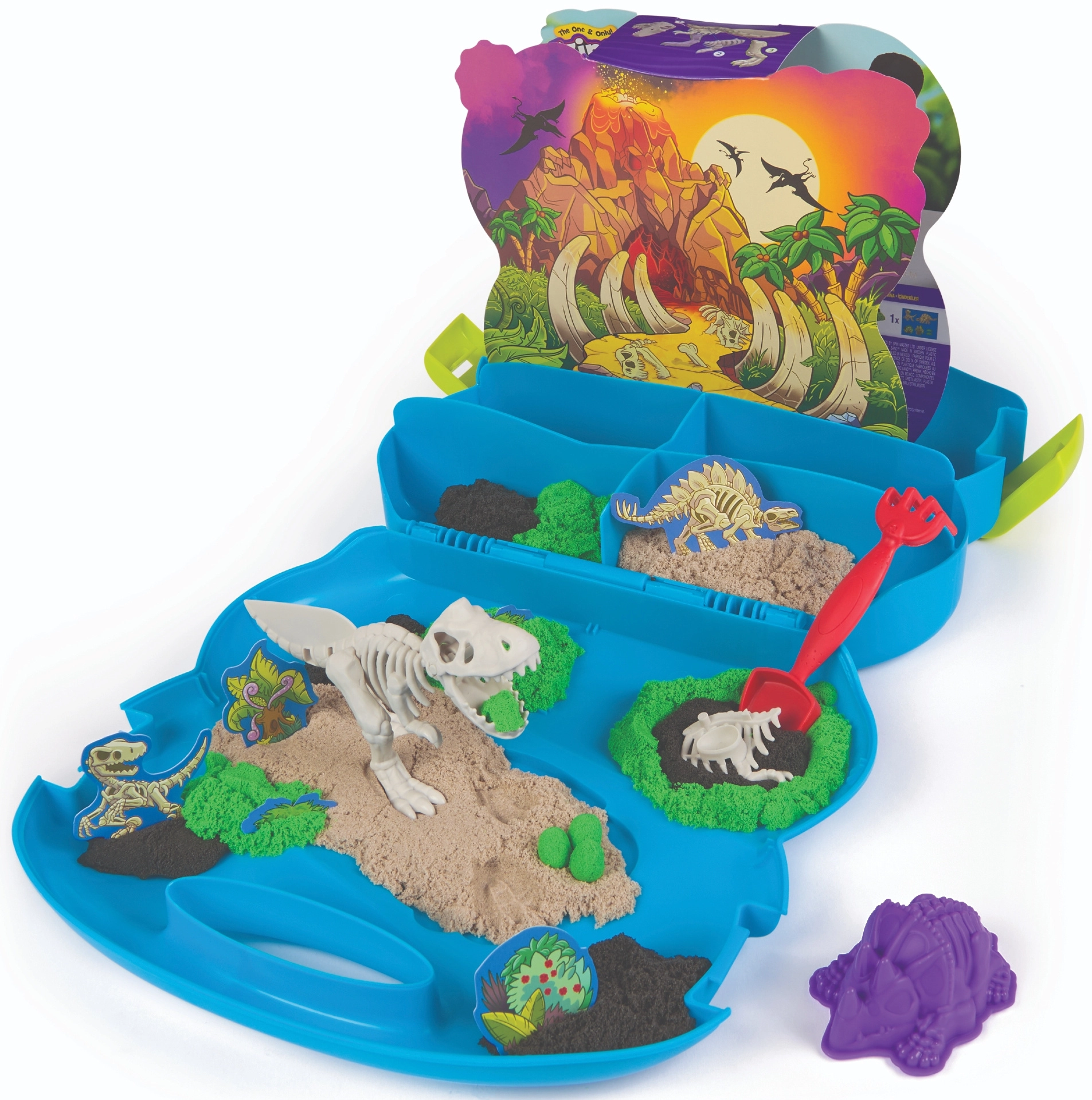 Kinetisch zand, T‑Rex-skelet, vormpjes en gereedschap, kartonnen figuren en achtergrond, draagbare bak