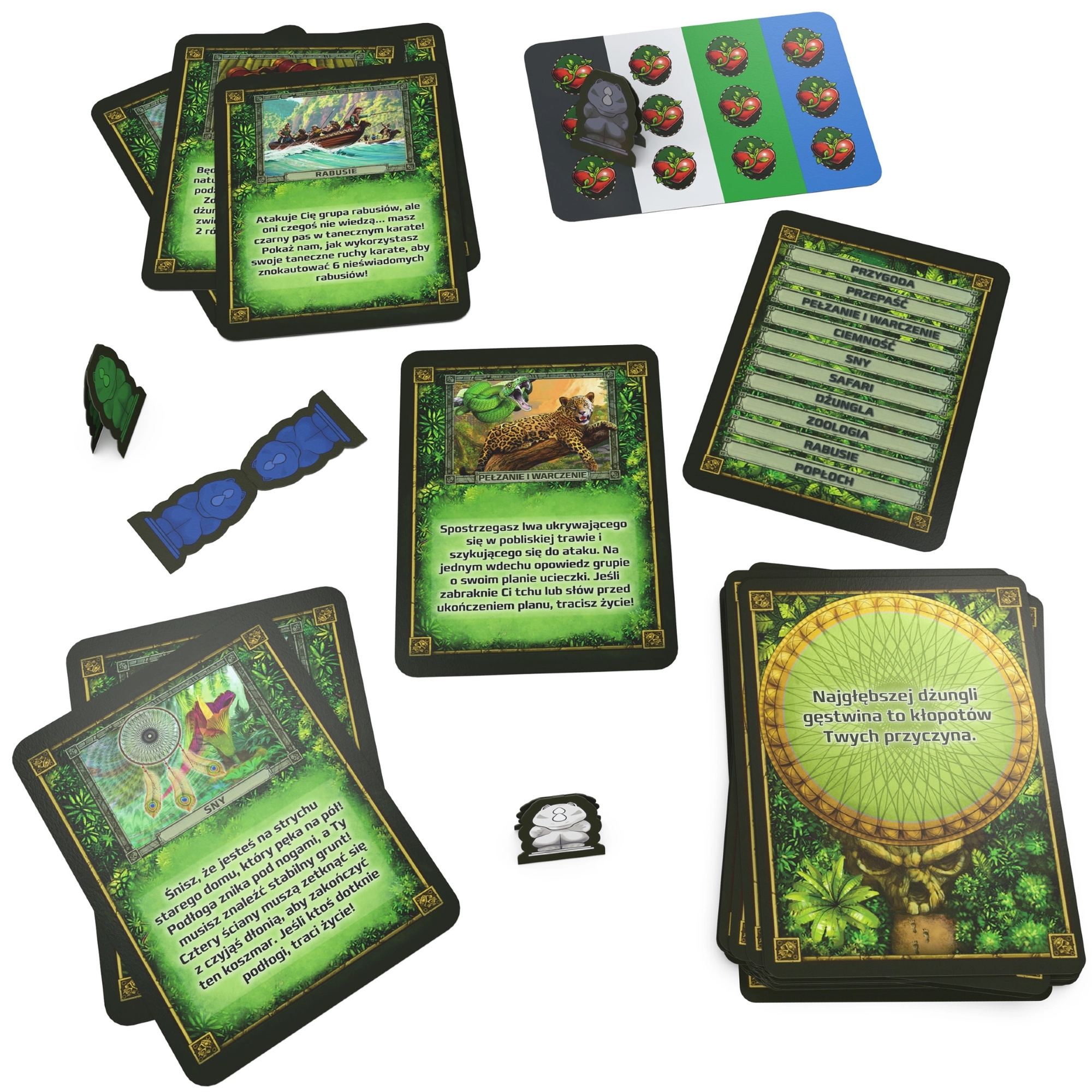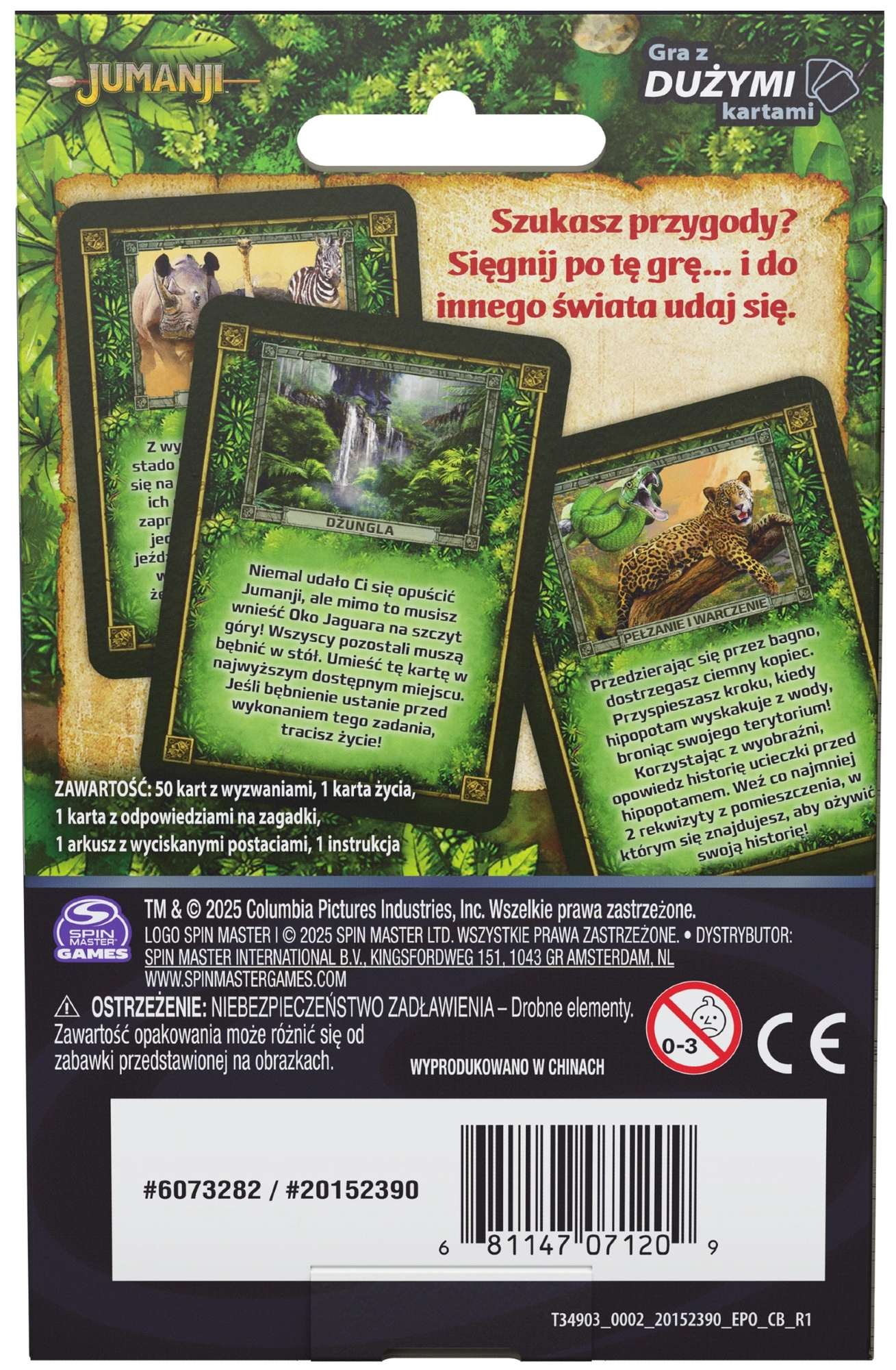 Betreed de JUMANJI-jungle met het familiespel van Spin Master. In de doos vind je meer dan 50 kaarten vol raadsels en uitdagingen die je moed en samenwerking op de proef stellen. Voltooi opdrachten, overleef gevaren en beleef plezier thuis, onderweg en met vrienden. Poolse taalversie, geschikt voor kinderen vanaf 8 jaar.