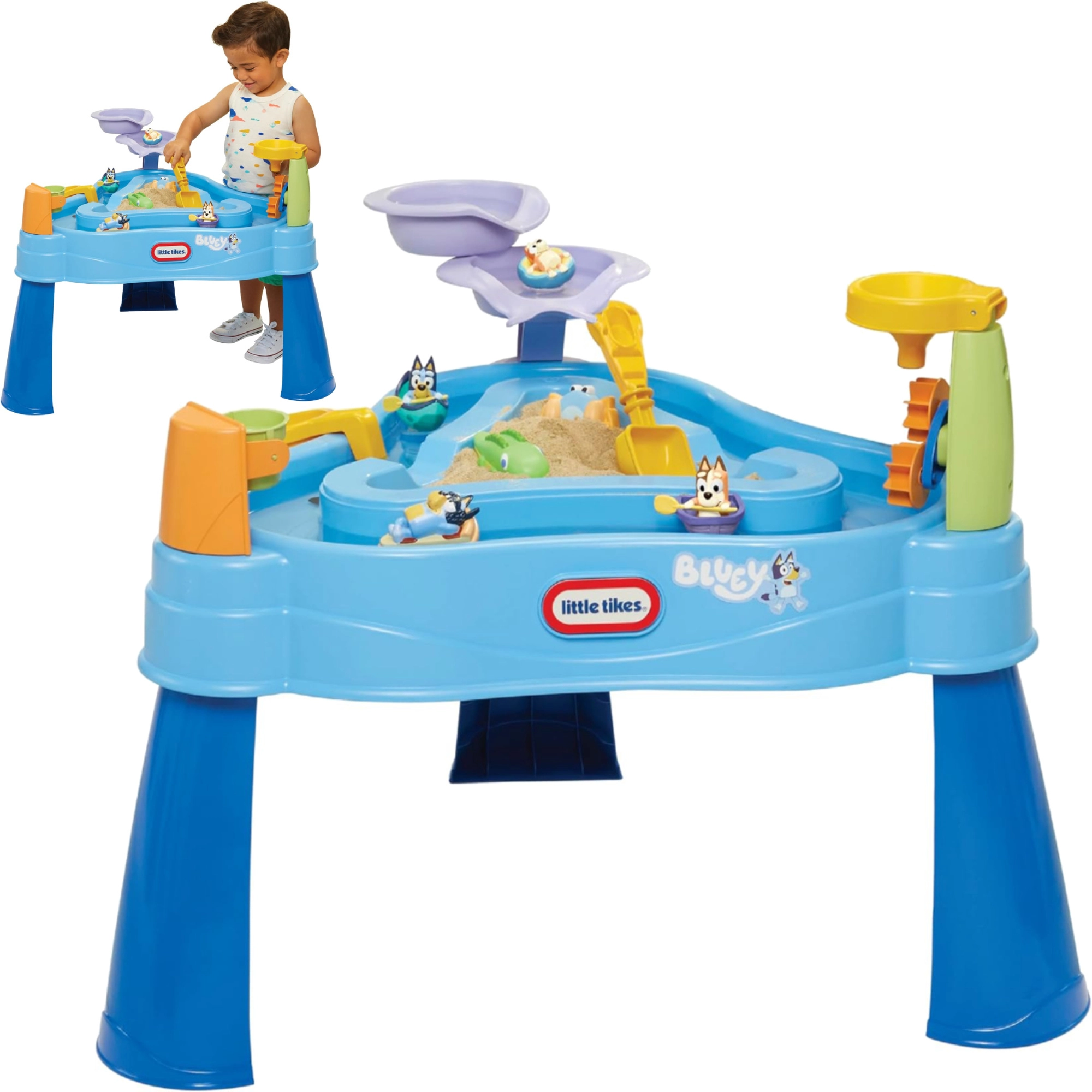 Ontdek de leuke water- en zandtafel van LITTLE TIKES met BLUEY-thema, die sensorisch spel, fijne motoriek en creatief ontdekken stimuleert. Dankzij het slimme 2-in-1 ontwerp met afneembare poten kun je spelen aan tafel of op de vloer. Kinderen genieten van de luie rivier, de binnenkamer voor zand, cascadebadjes, een gietemmer en een trechter met wielen, terwijl de drijvende figuurtjes Bluey, Bandit, Chili en Bingo inspireren tot rollenspel.